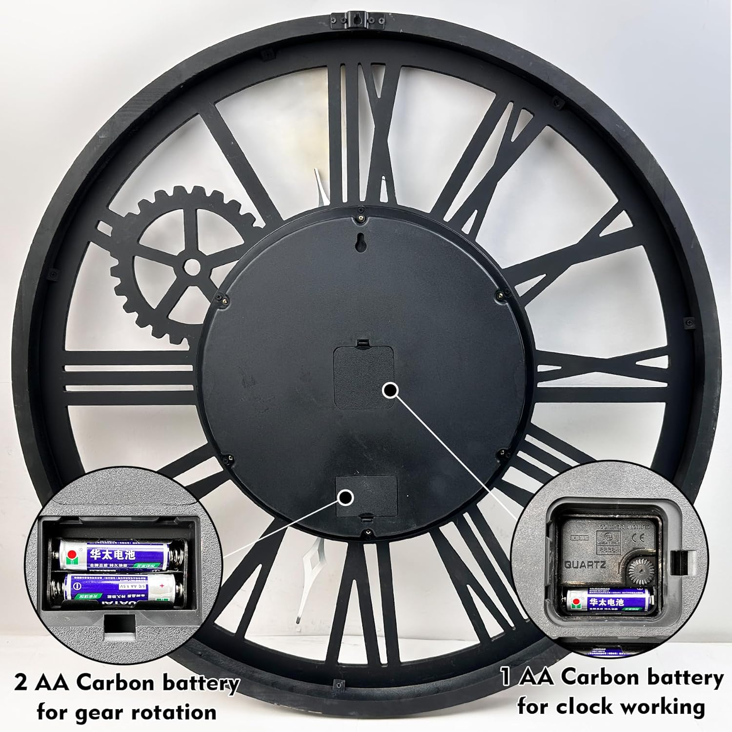• ACCURATE TIME& BATTERY OPERATED: Quality quartz sweeping mechanism for accurate time without any ticking sounds. Power by 3 AA Carbon battery operated (not included), large industrial clock takes 2 sets of batteries, one set for the clock and the other for gears that spin. Both of them can be used individually.