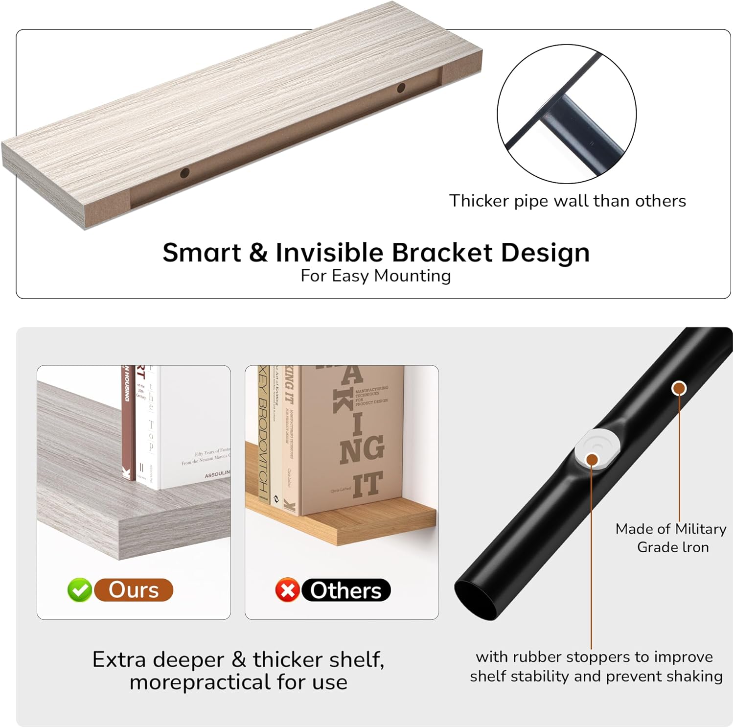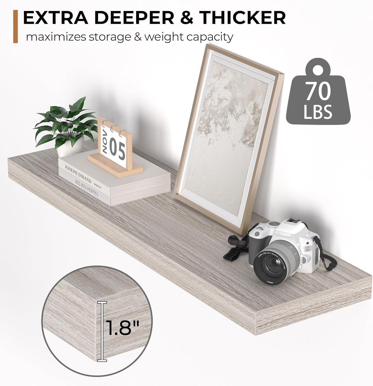 - Extra Deeper & Thicker - This wall shelf measures 36"W x 10.23"D x 1.8"H. Extra deeper and thicker design in order to bring maximizes storage space and weight capacity, even hold up to 70 lb. This floating shelf taking up zero square feet, reduces clutter and highlights dรฉcor in compact spaces.