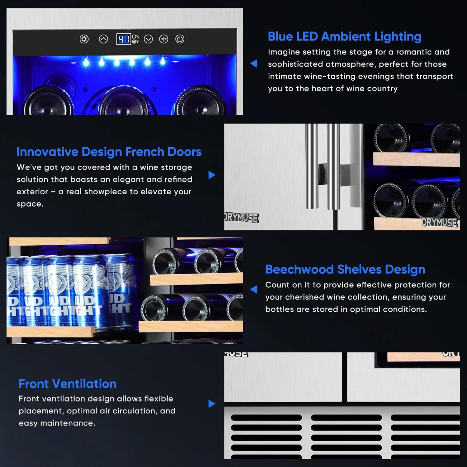 - WHY CHOOSE ORYMUSE - Whether you're a wine enthusiast or simply enjoy a perfectly chilled drink, the ORYMUSE Dual Zone Wine and Beverage Fridge is designed to enhance your experience. With independent temperature zones, ample storage space, and precise temperature control, your favorite wines and beverages are always served at the ideal temperature. Perfect for home bars, kitchens, offices, or entertainment areas, this sleek and stylish appliance delivers reliable performance, effortless convenience, and modern elegance β all in one