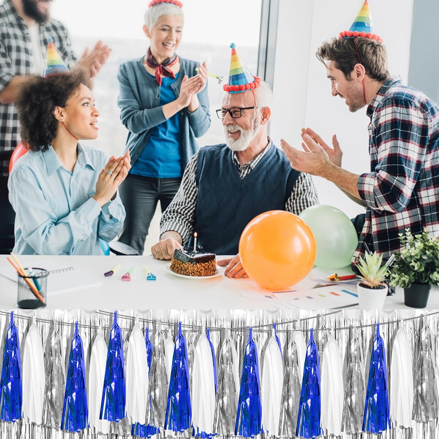 - 【Navy Blue White Silver Party Supplies Set】: The total length of the navy blue white silver birthday tassels banner is 29.5 feet 45tassels, divided into 3 strips, each 9.8 feet long. Each banner contains 15 tassels, and each tassel measures 14 inches, for birthday decorations many occasions, and so on