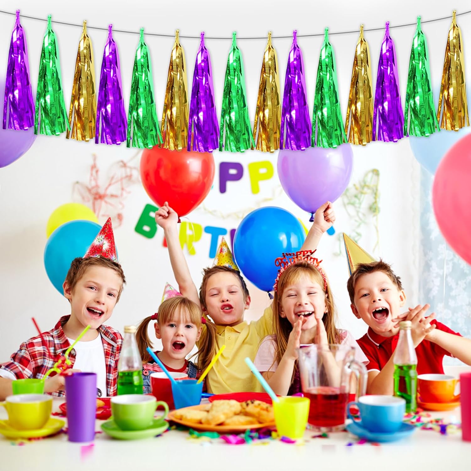 3P Purple Green Gold Foil Fringe Metallic Tassel Streamers Banner Tassel Garland for Parade Floats, Bachelorette, Wedding, Birthday, Halloween, Christmas, Bridal/Baby Shower Party Decorations