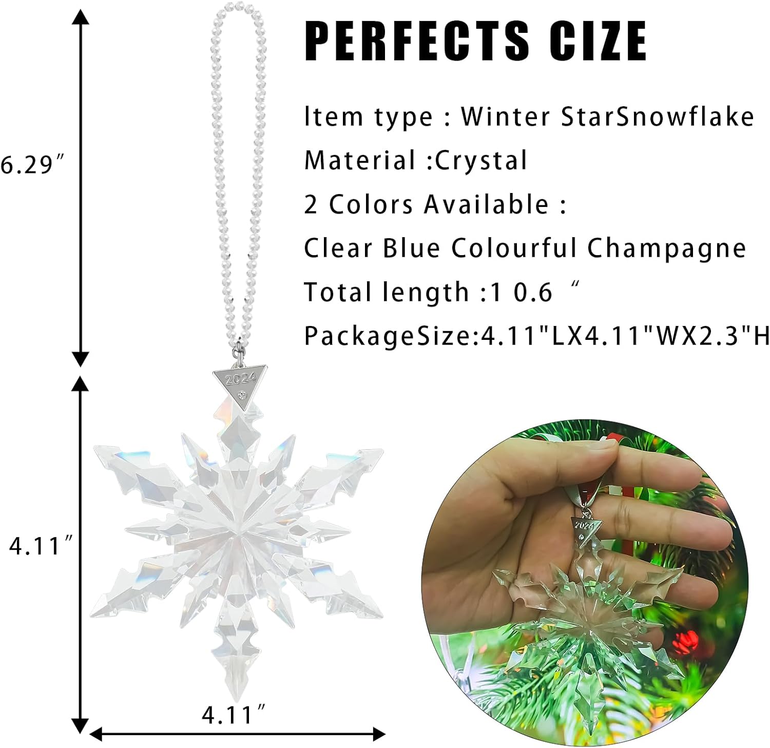 2024 Annual Christmas Ornaments Snowflake Star Clear White Faceted Crystal with Tone Metal Accents and Rayon Ribbon-New Year Christmas Tree Ornaments Crystal Sun Catcher Home Hanging Decor
