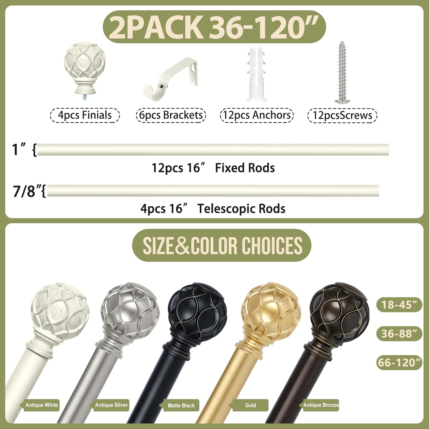- 2 Pack Curtain Rods for Windows 66 to 120 inch(5.5-10ft): TANGWIN antique white drapery rods include 12 x 16" x 1" fixed rods, 4 x 16" x 7/8" adjustable rods, 4 x finial, 6 x bracket, 10 x connector, 12 x anchor, 12 x screw. 2 Pack antique white curtain rods for windows can extend from 36 to 88 inches, choose the right size curtain rods according to the length of your window.
