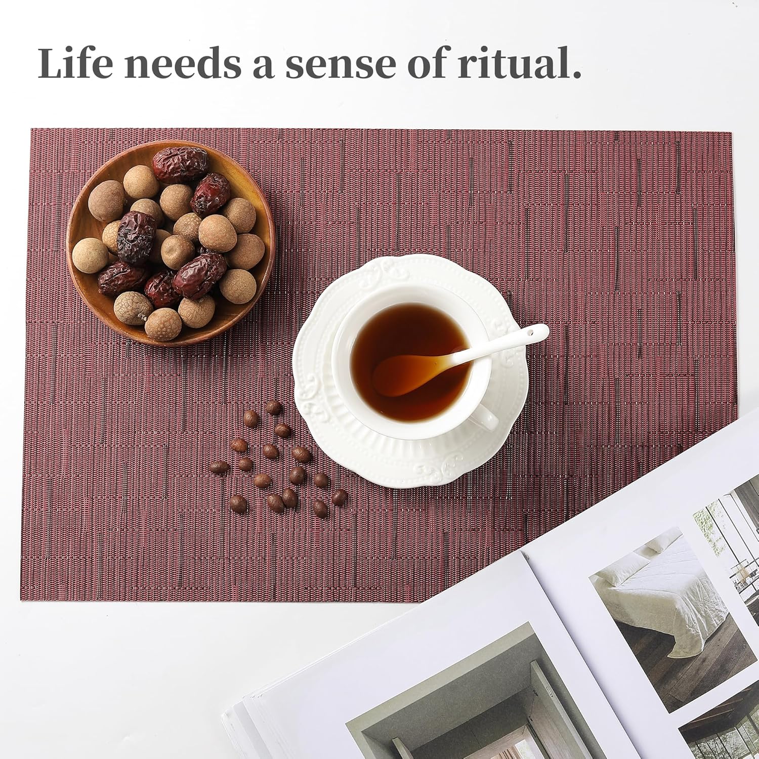 Leetaltree Burgundy Placemats Set of 8 - Heat Resistant Non-Slip Place mats for Dining Table, Washable Durable PVC Vinyl Woven Table Mats(Burgundy, 8)