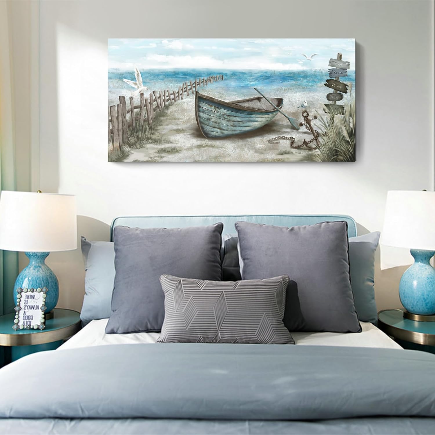 - Calming Seashore Aesthetic: This serene large coastal decor wall art captures sea bird resting on the rowboat. Behind the boat is blue ocean with the soaring seagulls. The nautical palette of blues, sand beige, tan, and fluffy white clouds provide a soothing feel. Hang this beach themed wall art up for a calming vibe, and escape to the beach each day after work in the comfort of your home.