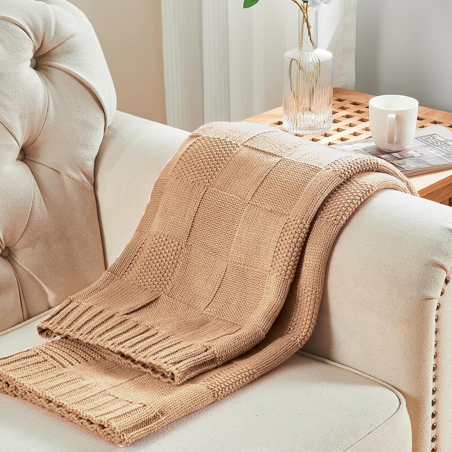 CozeCube Check Knit Throw Blanket, Beige Checkered Throw for Couch, Decorative Christmas Soft Cozy Warm Knitted Blanket for Bed Sofa Living Room, 60"X80"