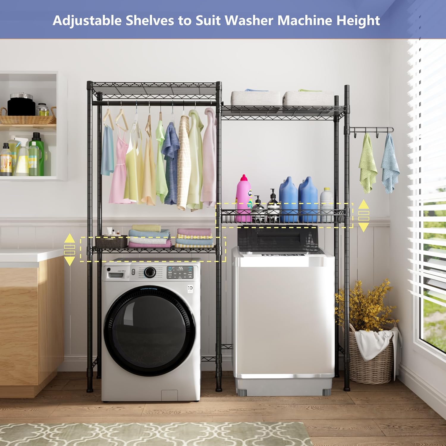 - Adjustable and DIY Assembly: Tailor the shelf rack to your needs with adjustable heights for both the shelf and bottom support rack. The clothes drying rack supports DIY assembly, allowing flexibility based on your requirements. Easily move the shelf installation position to accommodate different washing machine types and customize the quantity of shelves for personalized storage