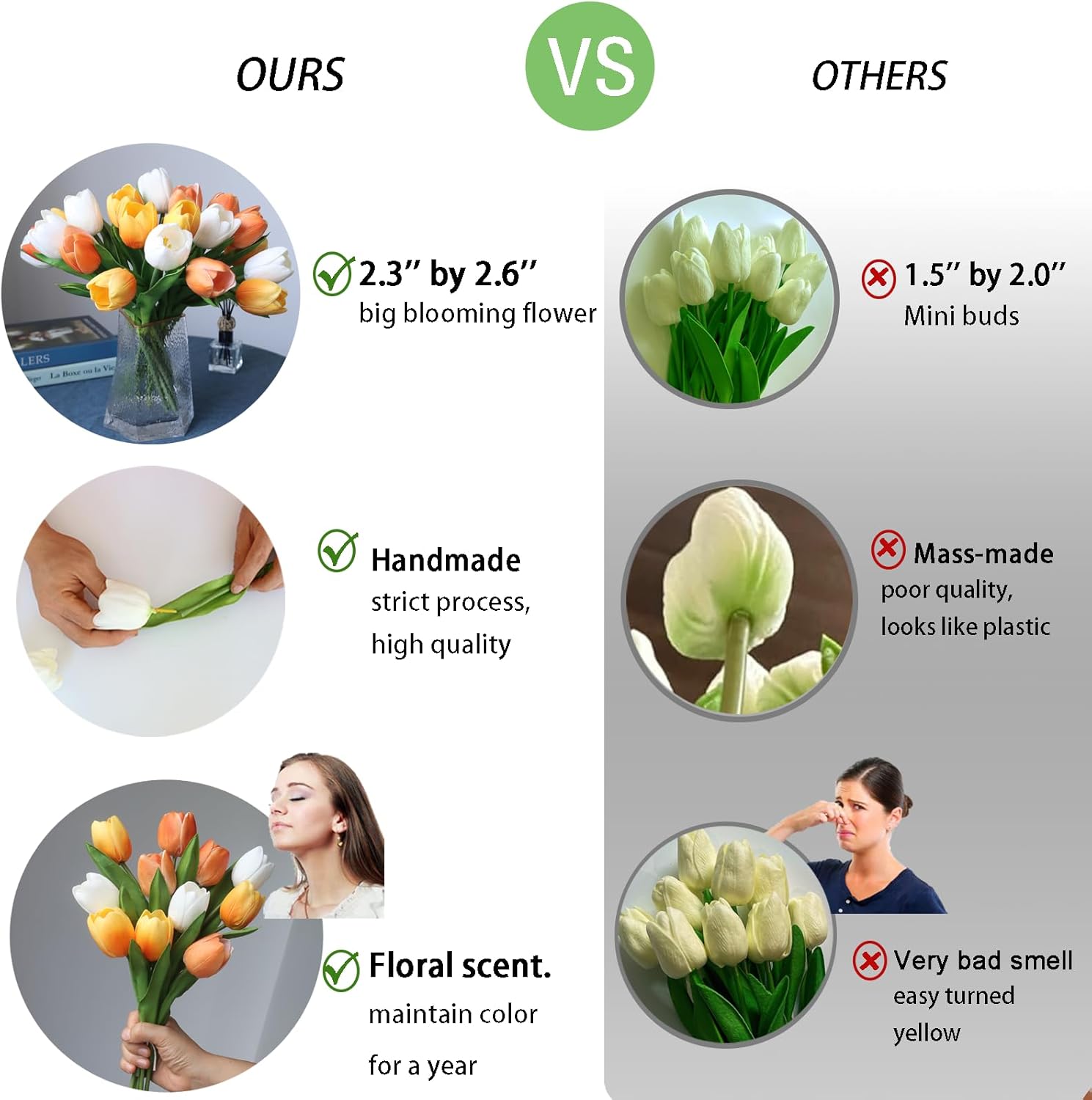 - Wide Applications: These artificial tulips are an ideal choice for fall home decor aesthetic,office,or commercial space decoration.You can use them on kitchen counter,dining table or anywhere else.They can also be used as decorations or centerpiece bouquets for weddings and parties,or as festival gifts for friends and family such as Valentine's Day, Easter,Mother's Day,Christmas,New Year and so on.Moreover,they are great props for photography,adding visual effects to your scene.