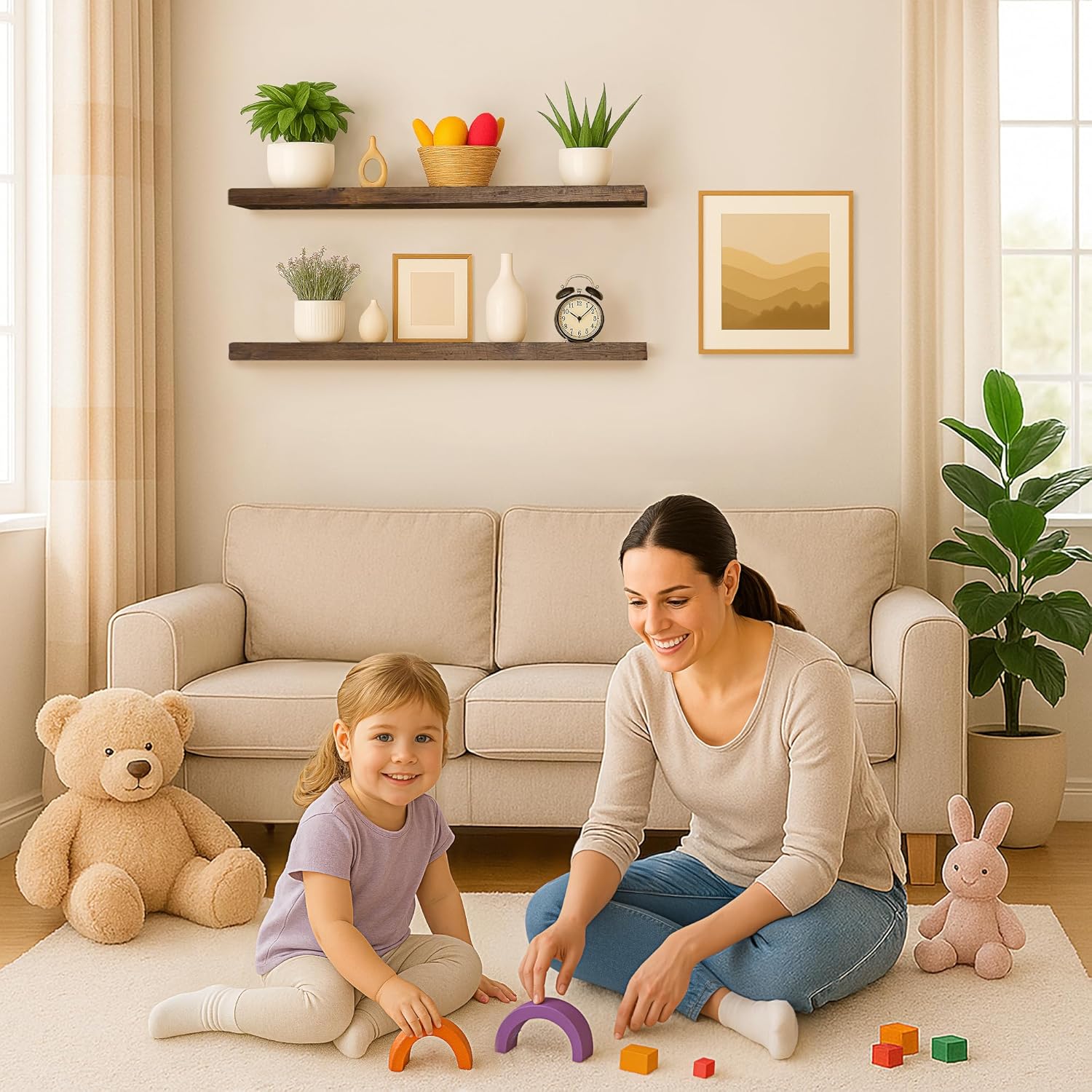 - Easy to Install: A set of two wide floating wooden shelves for wall includes stainless-steel hidden brackets, universal plugs, an instruction manual, and a video guide. Even beginners can easily handle the installation