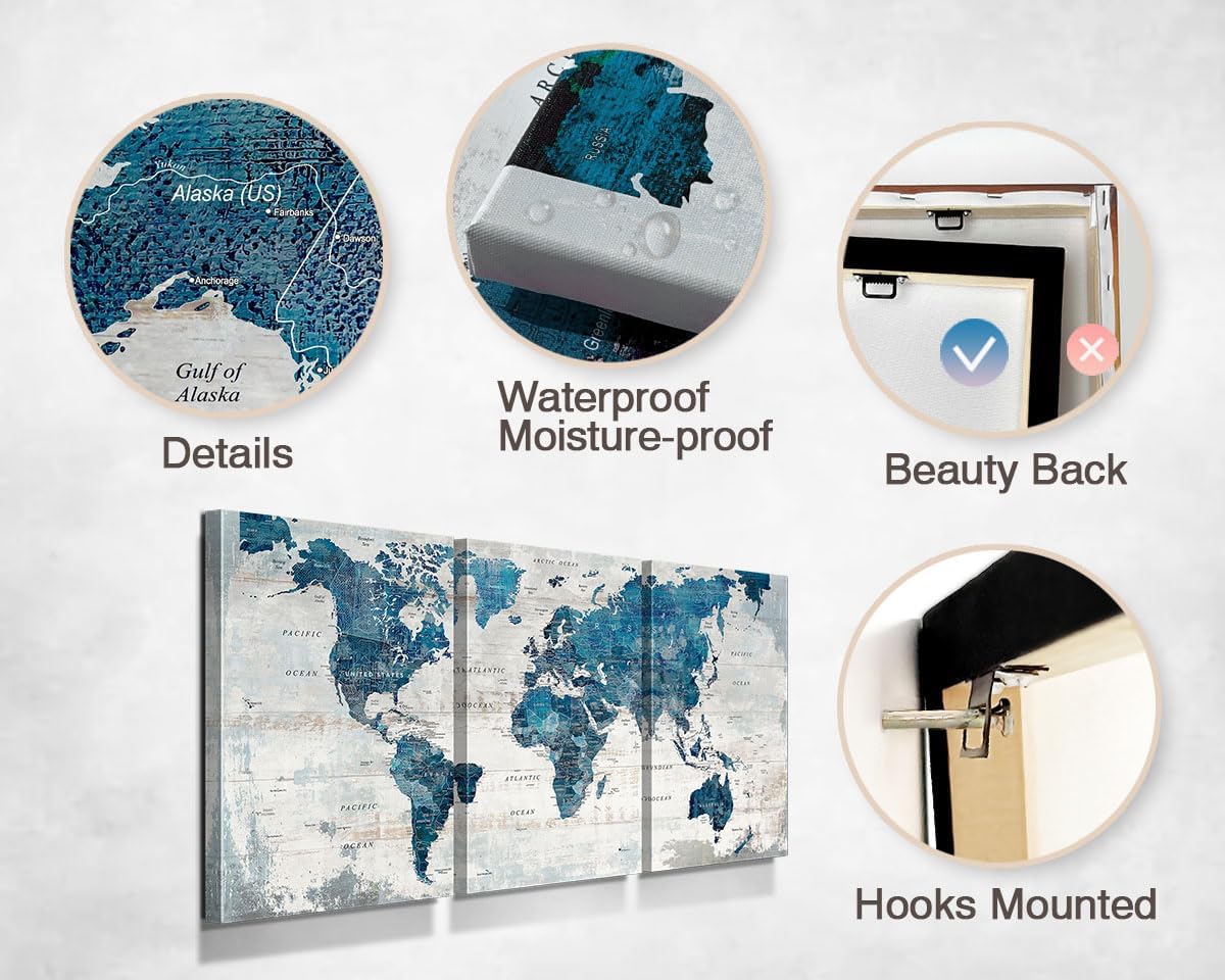 Large Wall Art Canvas Wall Decor Living Room Vintage Giant Blue Map Pictures Office Decorations Rustic Decor Travel Paintings Oversized