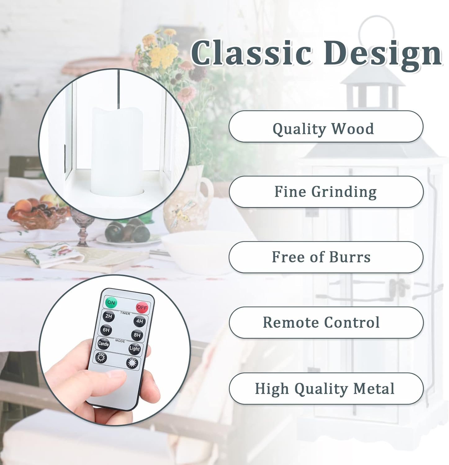• Vintage Design: The white lanterns decorative with four-sided clear glass panes, metal top and wood frame, combined with white and gold into a retro vintage color, creates an old-world charm and adds a gorgeous and elegant aesthetic. This adds to the classic beauty and creates an elegant look that can be used flawlessly year after year