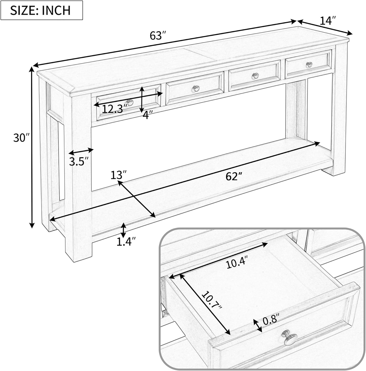 - 🌳【Long Console Table】The console table 63''L x 14''W x 30''H .Solid Wood Sideboard Console Table features a retro design that adds a touch of vintage charm to your living room, kitchen, or dining room. Its classic aesthetic enhances the overall ambiance of your space