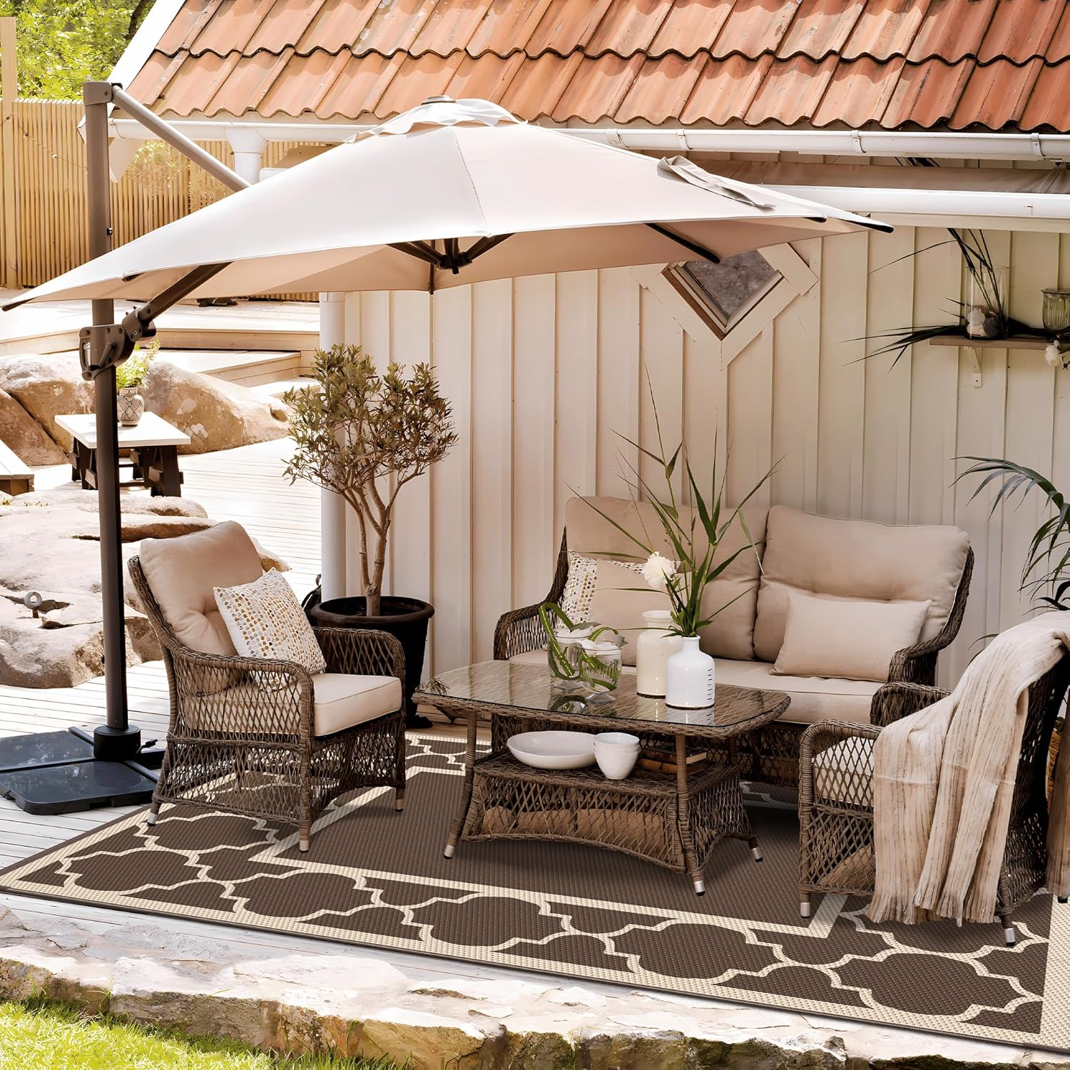 GENIMO 6' x 9' Outdoor Rug Waterproof for Patio Decor, Foldable Reversible Plastic Straw Area Rugs Mat for Camper, Outside Carpet for Rv, Deck, Porch, Picnic, Beach, Balcony, Coffee & Beige