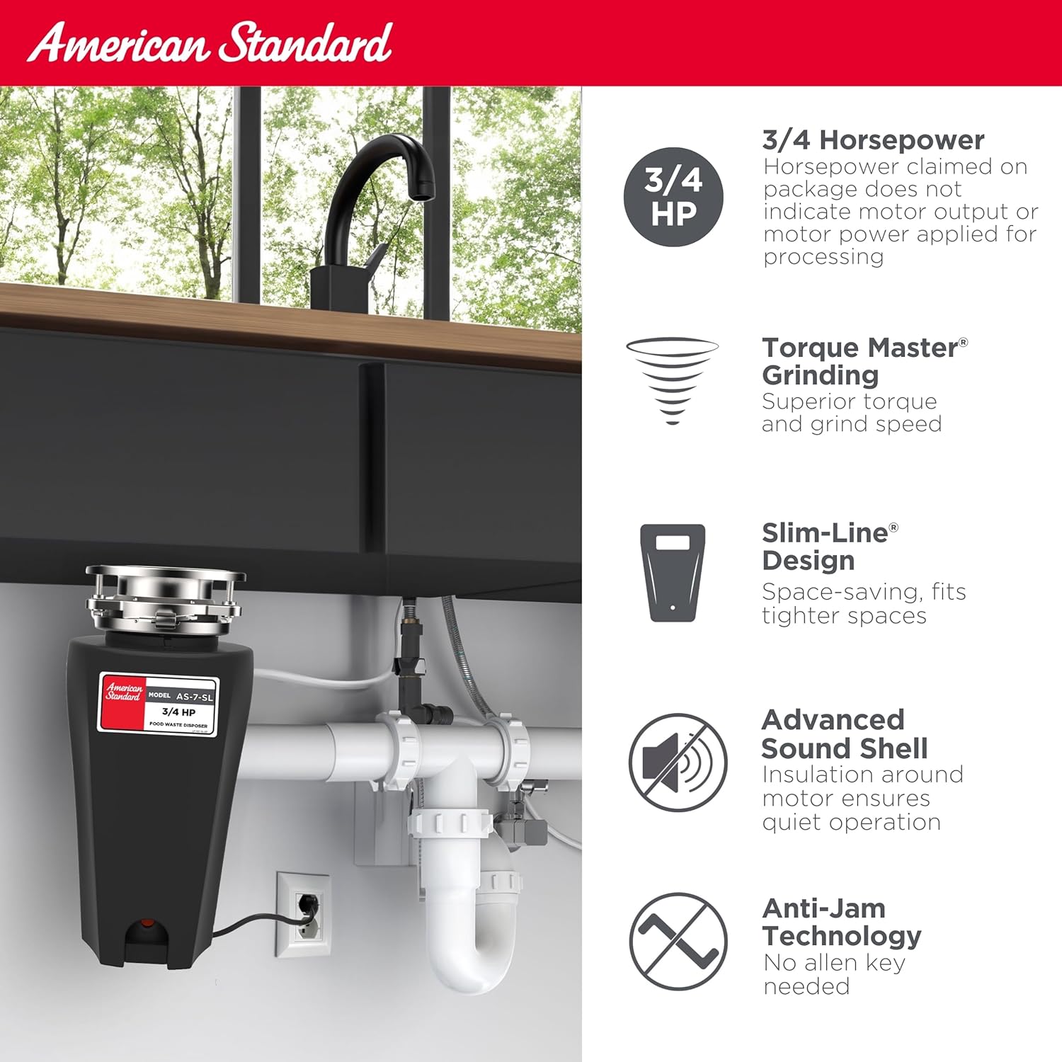 American Standard 10-US-AS-7-SL Garbage Disposal Anti-Jam Stainless Steel Food Waste Grinding System, Slim Line, 3/4 HP, Black