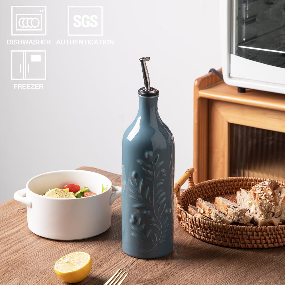 Sweejar Large Olive Oil Dispenser Bottle with Spout, 24 Oz Ceramic Oil Dispenser for Kitchen, Relief Opaque Oil Cruet, Oil Container for Cooking, EVOO, Avocado Oil, Vinegar, Pack of 1(Fog Blue)