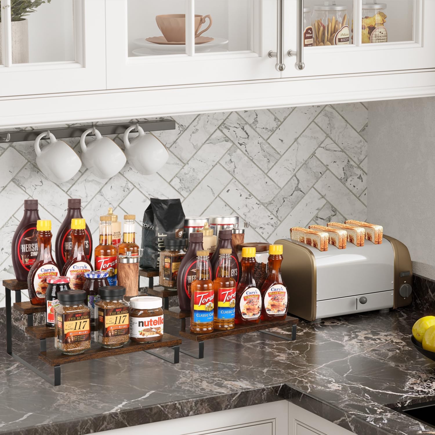 YINMIT Wooden Display Riser Stand, Tiered Perfume and Cologne Organizer Stand, 4 Tier Spice Rack Organizer, Rustic Display Shelf for Candles (4 Tier, 2 Pack)