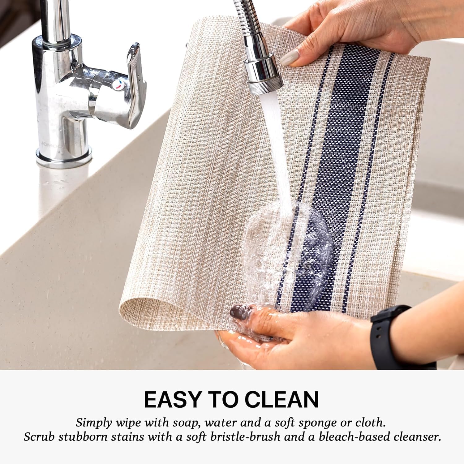 - EASY TO CLEAN:The washable placemats can be washed repeatedly.How to clean the place mats for kitchen table:Simply wipe with soap,water and a soft sponge or cloth.Scrub stubborn stains with a soft bristle-brush and a bleach-based cleanse.