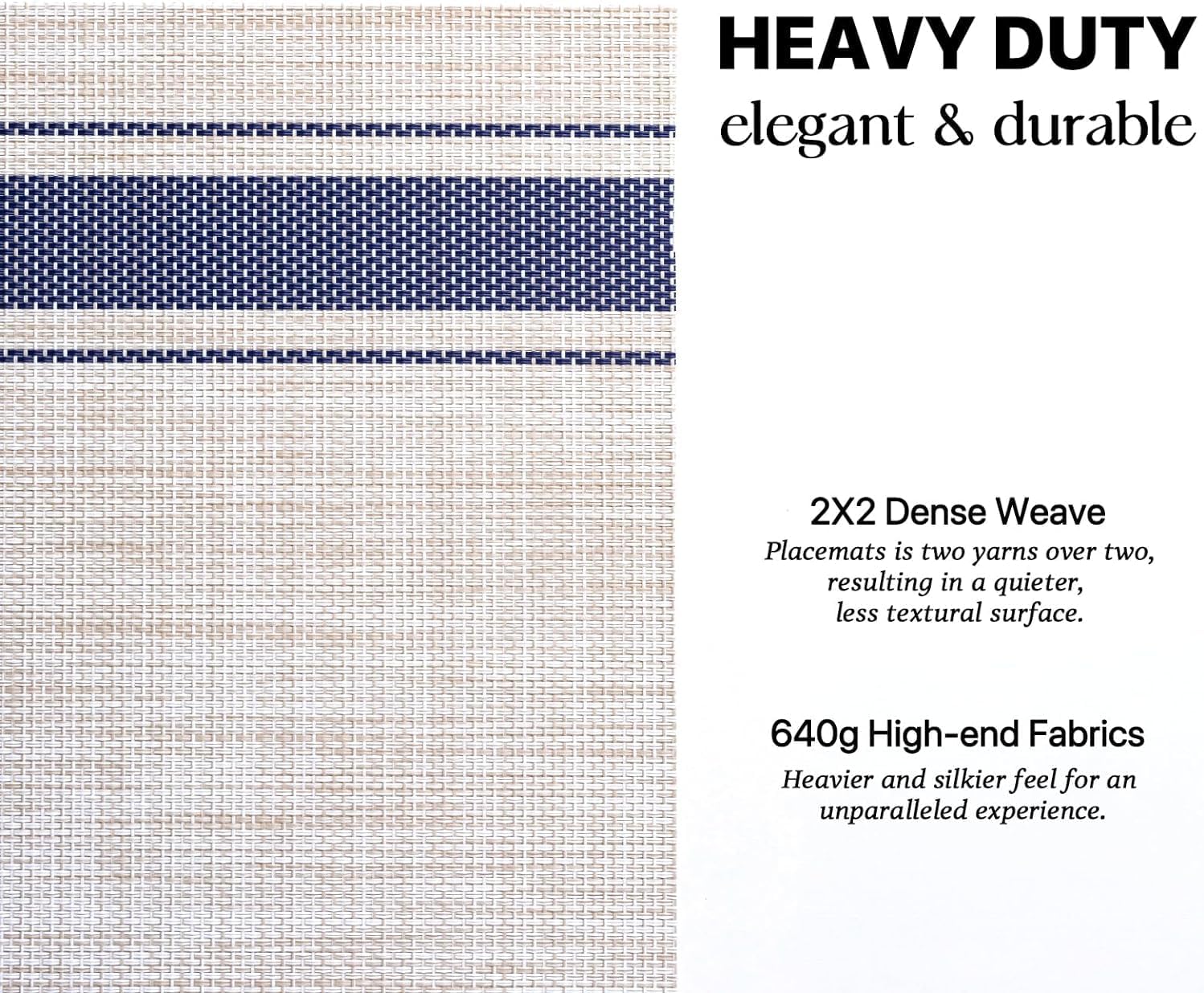 - HEAVY-DUTY:We uses the German-imported higher grammage vinyl material (Specialty PVC)than other placemats on the market,plus the precise,dense weave craftsmanship to give the woven placemats a thicker feel and make the place mats long-lasting.