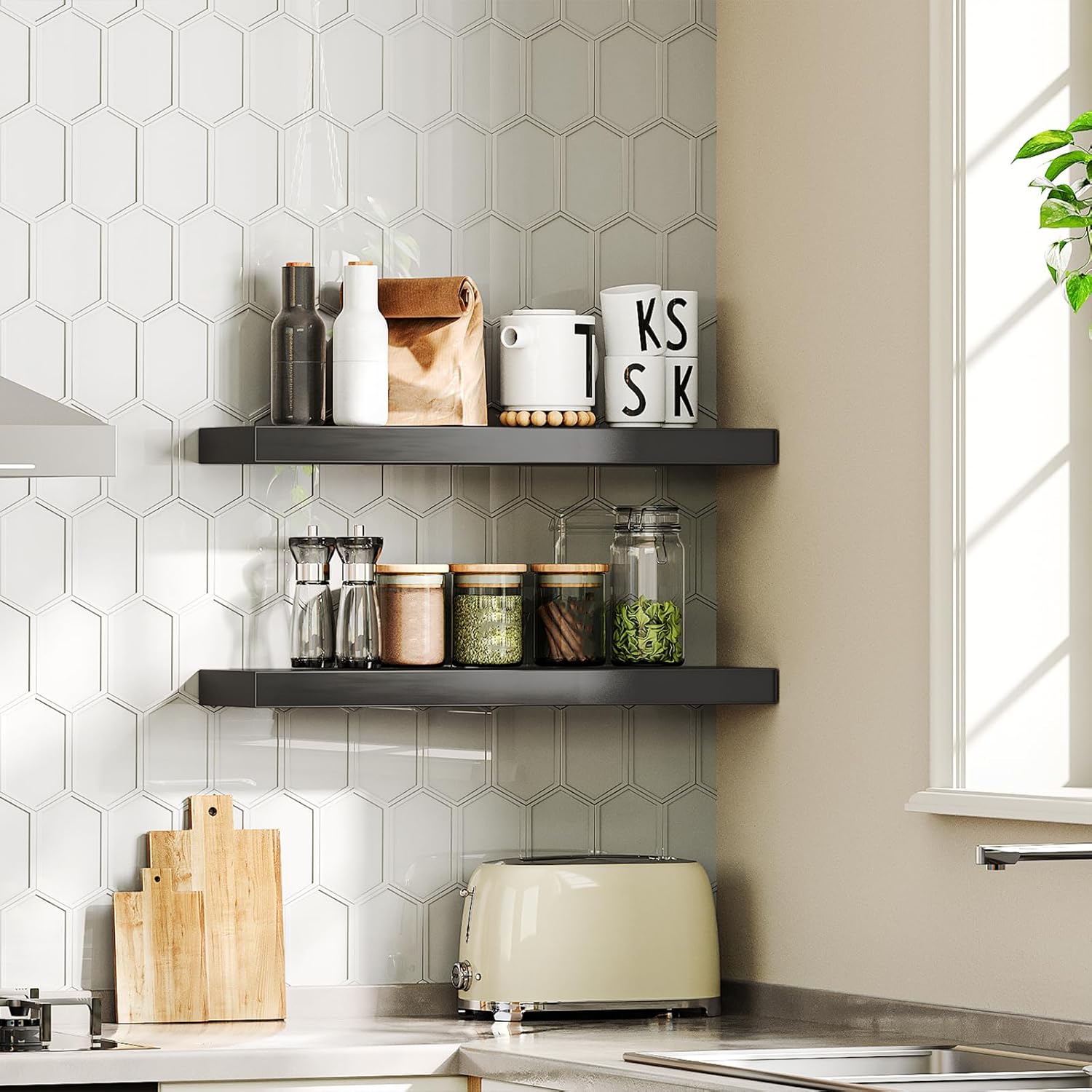 HOOBRO Floating Shelves for Wall, Wall Mounted Shelf Set of 2, 23.6" Hanging Shelf with Invisible Brackets, for Wall in Bathroom, Bedroom, Toilet, Kitchen, Living Room, Office, Black BK60BJ01