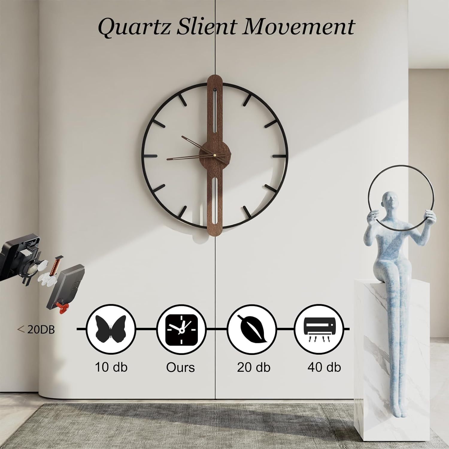 Modern Walnut Dial Wall Clock, Wood Large Wall Clock Decor Metal Frame Silent Non Ticking for Living Room, Bedroom, Kitchen, Study Decoration, Handmade Home Present Idea, 20 in (50 cm)
