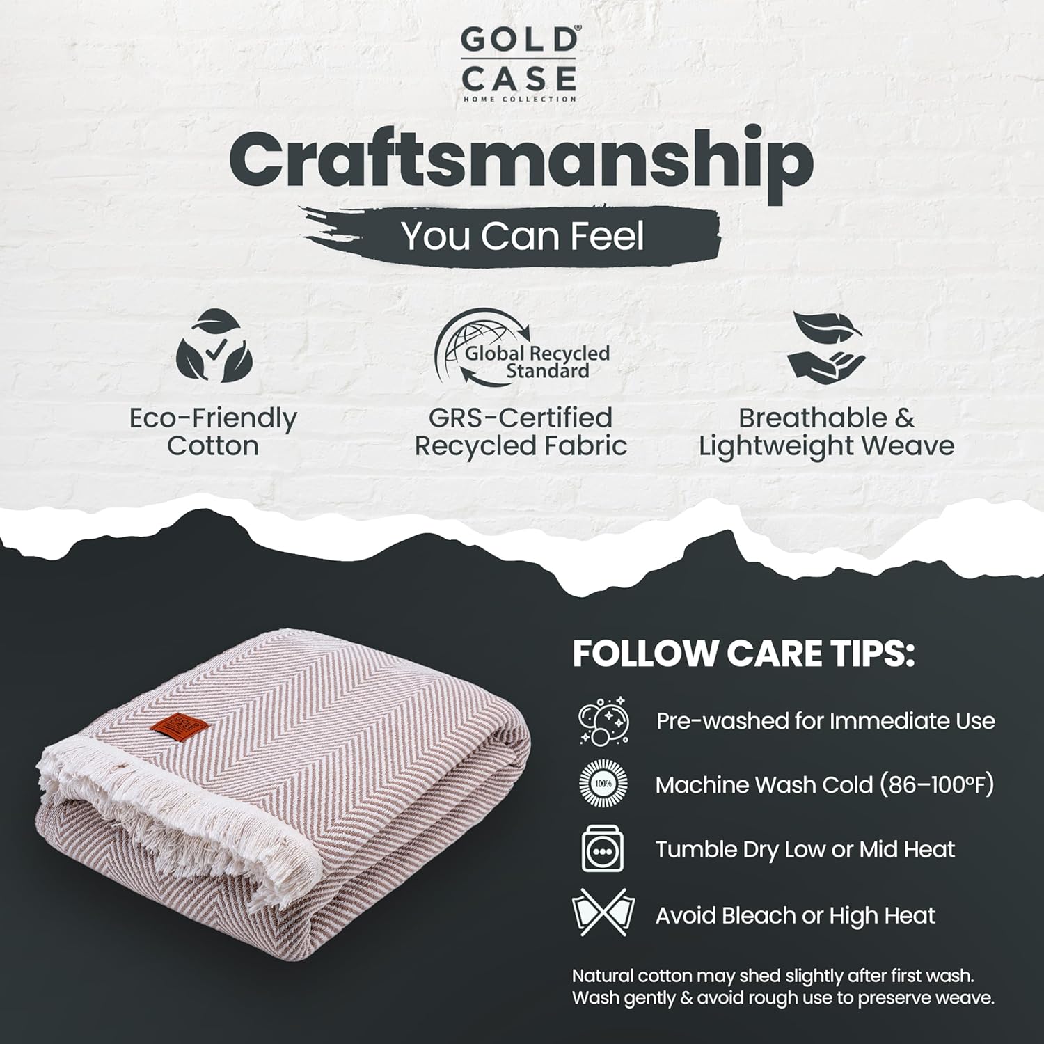 Gold Case Throw Blanket for Bed – 100% Recycled Turkish Cotton Bed Blanket – Decorative Throw Cotton Blankets for Living Room & Bedroom – Woven Twin Blankets - 71x90 - Elegant Beige