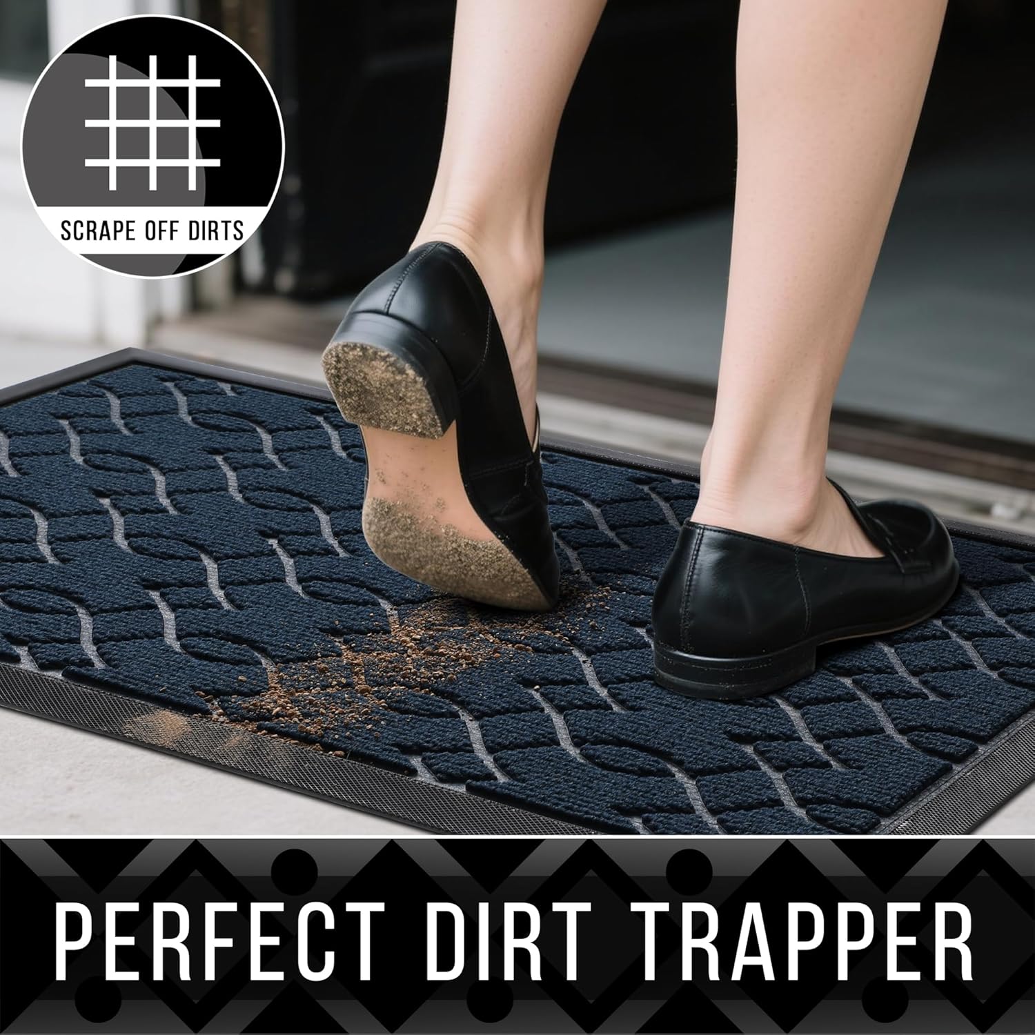 - 【Capture Dirt and Moisture】: Yimobra front door mat adopts heart striped groove design, forming a detention dam extending in all directions, helping to capture dirt, dust, gravel, mud, sand, grass or other messy debris and prevent them from entering Indoor; The surface of floor mat beautifully woven polyester fabric absorbs moisture, and the sturdy oblique rubber edge will not accumulate water in rainy and snowy days, keeping your home dry and clean