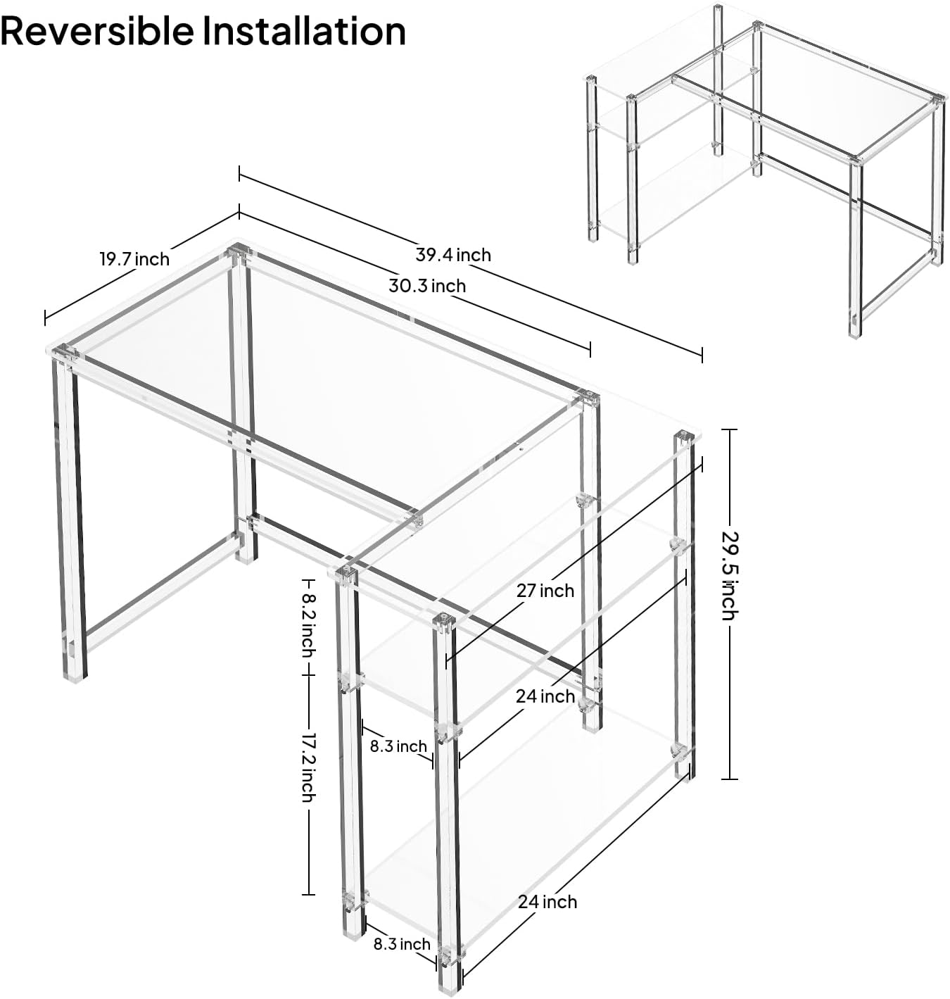Eglaf Acrylic L-Shaped Desk - Clear Desk with Reversible Storage Shelves - Modern Home Office Desk Corner Desk for Study, Writing, Rectangular Legs, Easy Assembly, 39.4" L x 27''W x 29.5" H
