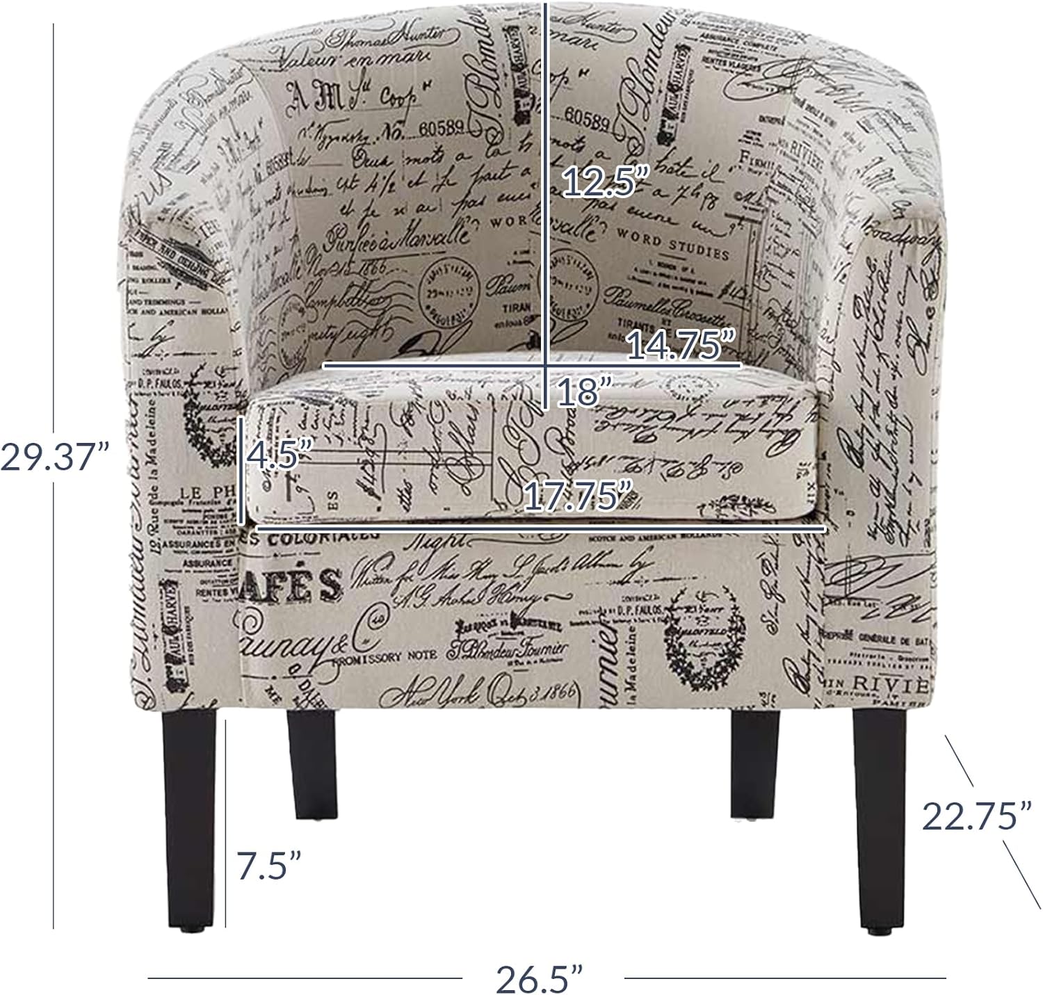 - [EASY TO ASSEMBLED] Set up will take under 5 minutes and all hardware is included. Once fully-assembled, the overall dimensions are 22.75"D x 26.5"W x 29.37"H and this club chair can support up to 300 pounds.