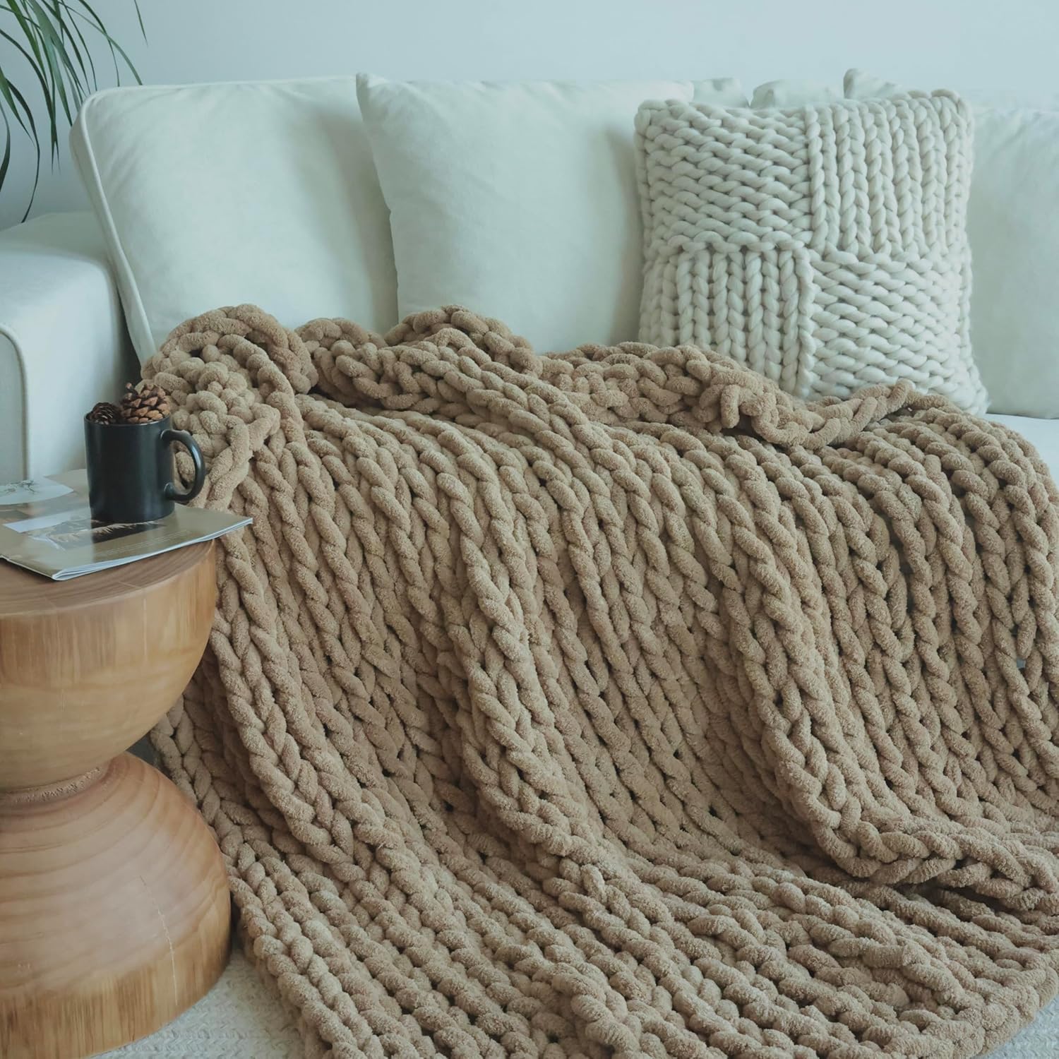 Maetoow Chenille Chunky Knit Blanket Throw (50×60 Inch), Handmade Warm & Cozy Blanket Couch, Bed, Home Decor, Soft Breathable Fleece Banket, Christmas Thick and Giant Yarn Throws, Khaki