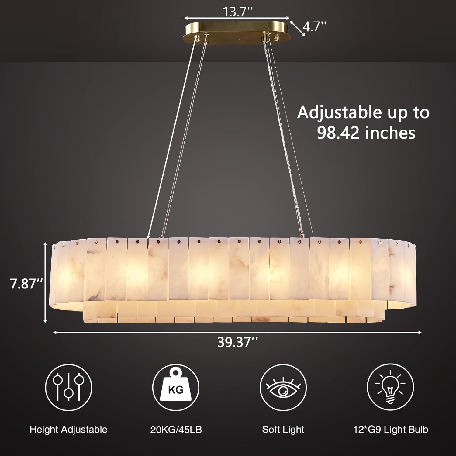 Alabaster Rectangular Chandelier for Dining Room, L39in Modern Chandeliers, Adjustable Marble Pendant Light Fixture, Rectangle Chandelier for Dining Table Living Room Kitchen Island (Bulbs INCL)