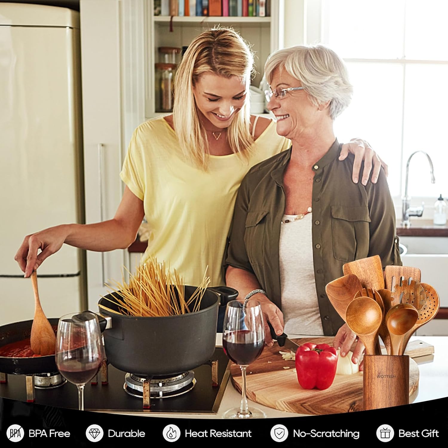 - 10-Piece Kitchen Utensils Set: Our complete wood kitchen utensil set includes all the essential cooking tools, such as a flat spatula, fried spatula, slotted spatula, kitchen utensil holder, strainer spoon, Soup Ladle,spaghetti spoon,salad fork, salad spoon, and mixing spoon. This comprehensive set covers all your kitchen needs from stirring to cooking