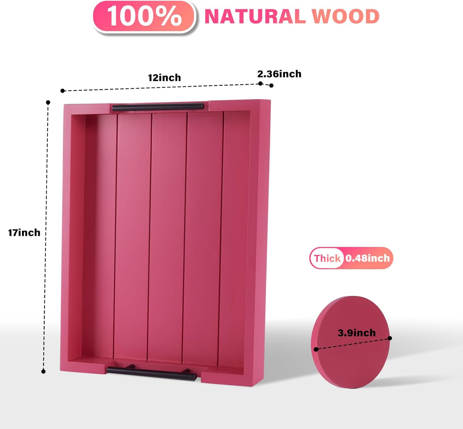 - BEAUTIFUL HANDCRAFTED DESIGN β Carefully crafted from premium quality fir wood with fine attention to details, our wooden serving tray set or tray for ottoman coffee table has ergonomically fitted metal handles for ease of carrying. Measuring 17βx 13β, this wood serving tray (rectangle) is the ideal size to carry snacks, drinks, and meals around the house without any hassle - WONDERFUL home decor!