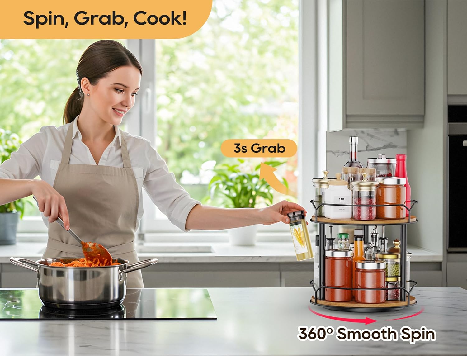 - 1. Stay Organized in Style: Ditch clutter and stay organized with our two-tier turntable Lazy Susan! This beautiful wooden rotating spice rack spinner is perfect for any table top, farmhouse bathroom decor, round decorative tray for your vanity, counter, sink, coffee table, and much more