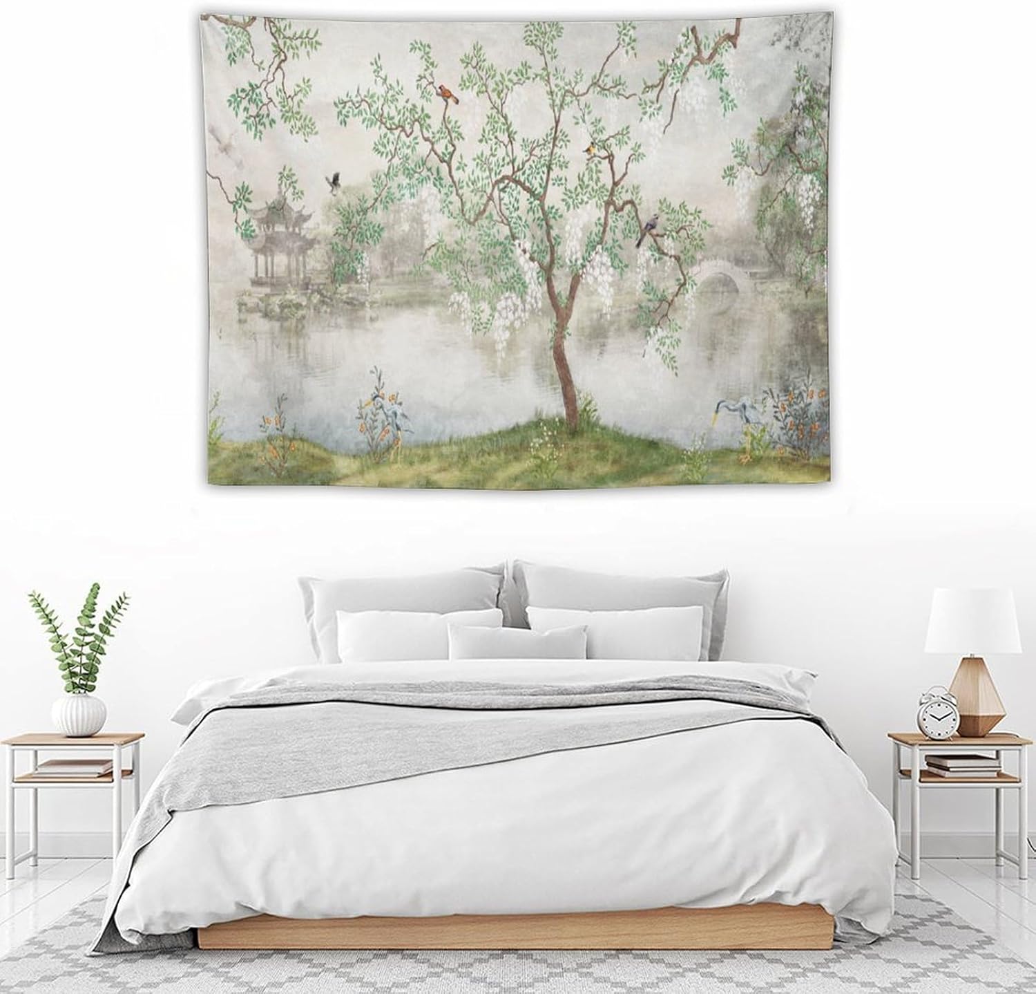 HZOHNAGO Japanese Tapestry Tree Misty Garden Lake Printed Wall Tapestry Ink Painting Wall Hanging for Bedroom Living Room Dorm 40" W x 30" H