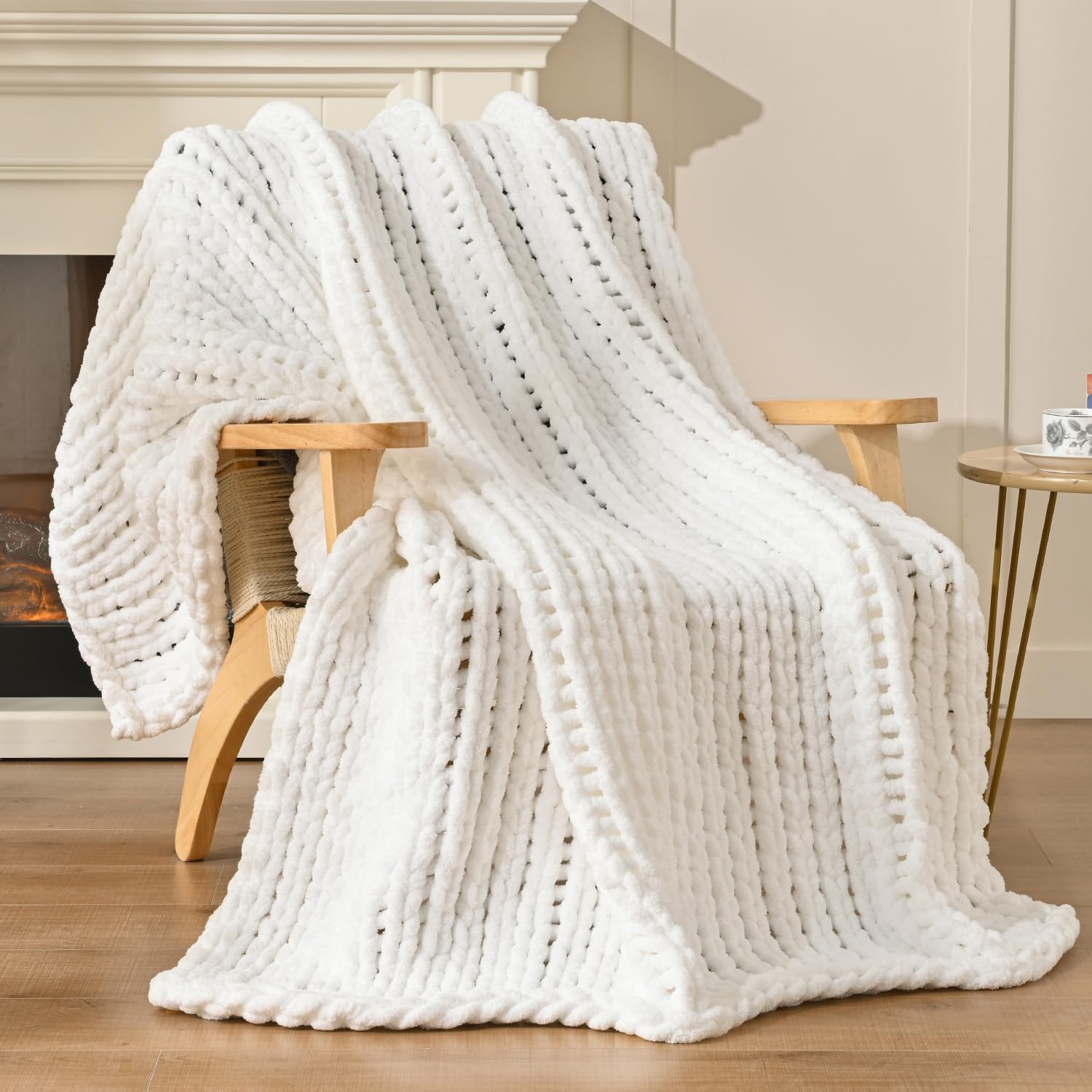 Esterra Chunky Knit Blanket Throw 40"x50", 100% Hand Knitted Chenille Throw Blanket, Cozy Soft Thick Cable Knit Throw Large Rope Knot Crochet Throw Blanket for Sofa Couch Bed, Snow White