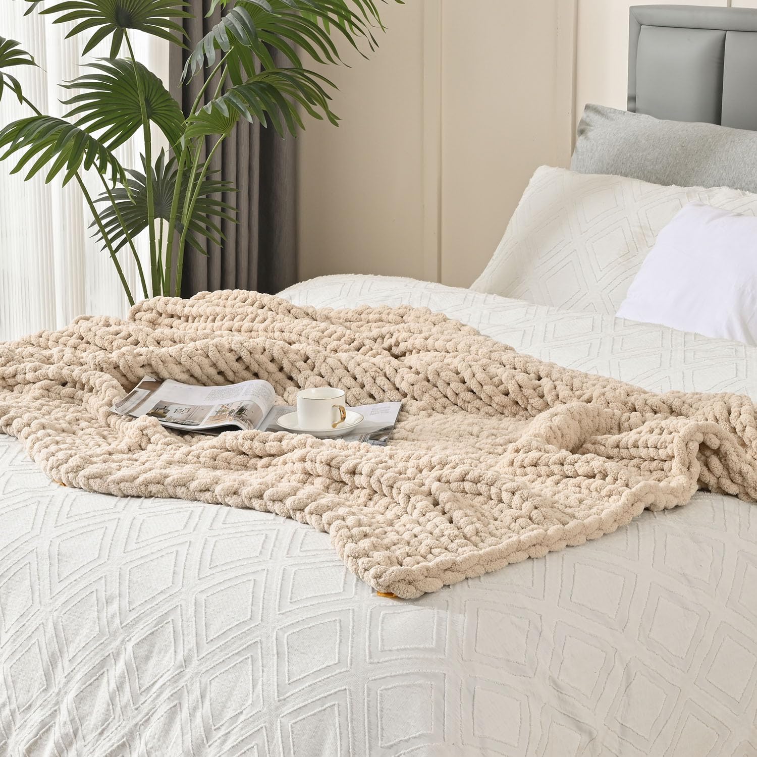 Esterra Chunky Knit Blanket Throw 50"x60", 100% Hand Knitted Chenille Throw Blanket, Cozy Soft Thick Cable Knit Throw Large Rope Knot Crochet Throw Blanket for Sofa Couch Bed, Sandshell/Oatmeal