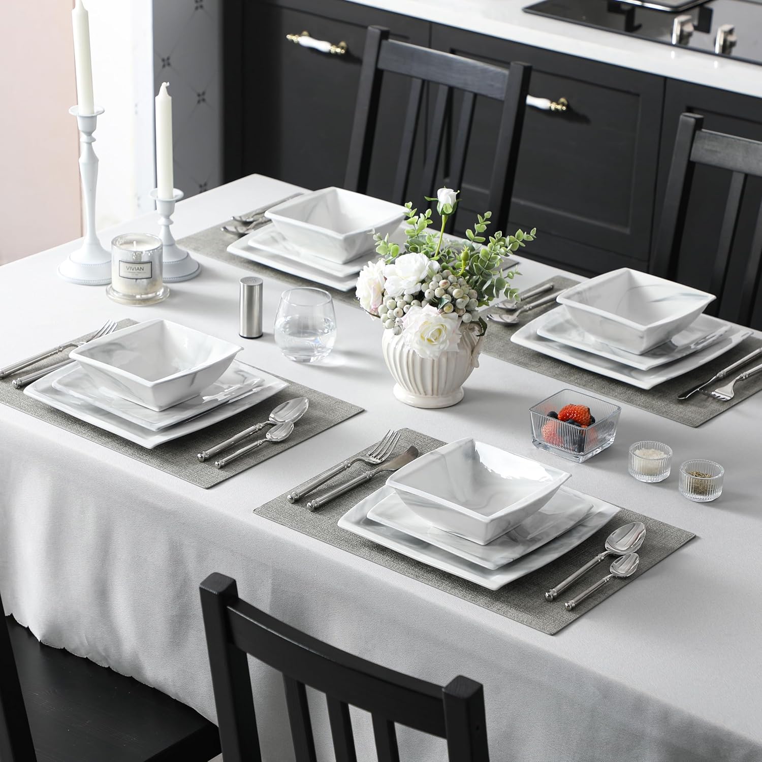 MALACASA Plates and Bowls Sets, 12-Piece Porcelain Dinnerware Sets for 4, Square Plates and Bowls for Dessert, Salad and Soup, Ceramic Dishes Dining Dishware Set, Marble Grey, Series Blance