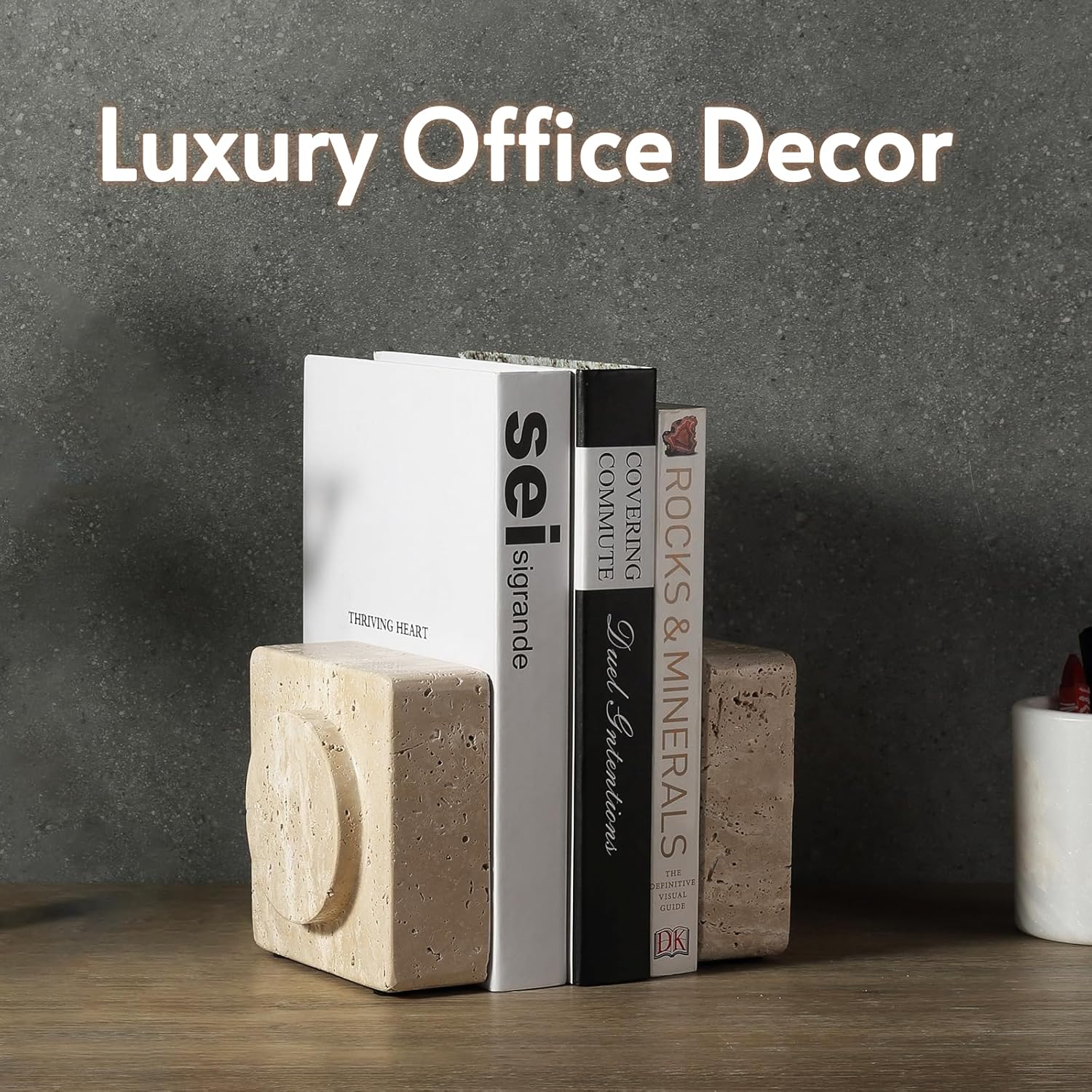 Koville Marble Square Book Ends, Heavy Duty Book Holders, Bookends for Shelves, Office Bookshelf Decor for CDs/Video Games(Travertino Romano)