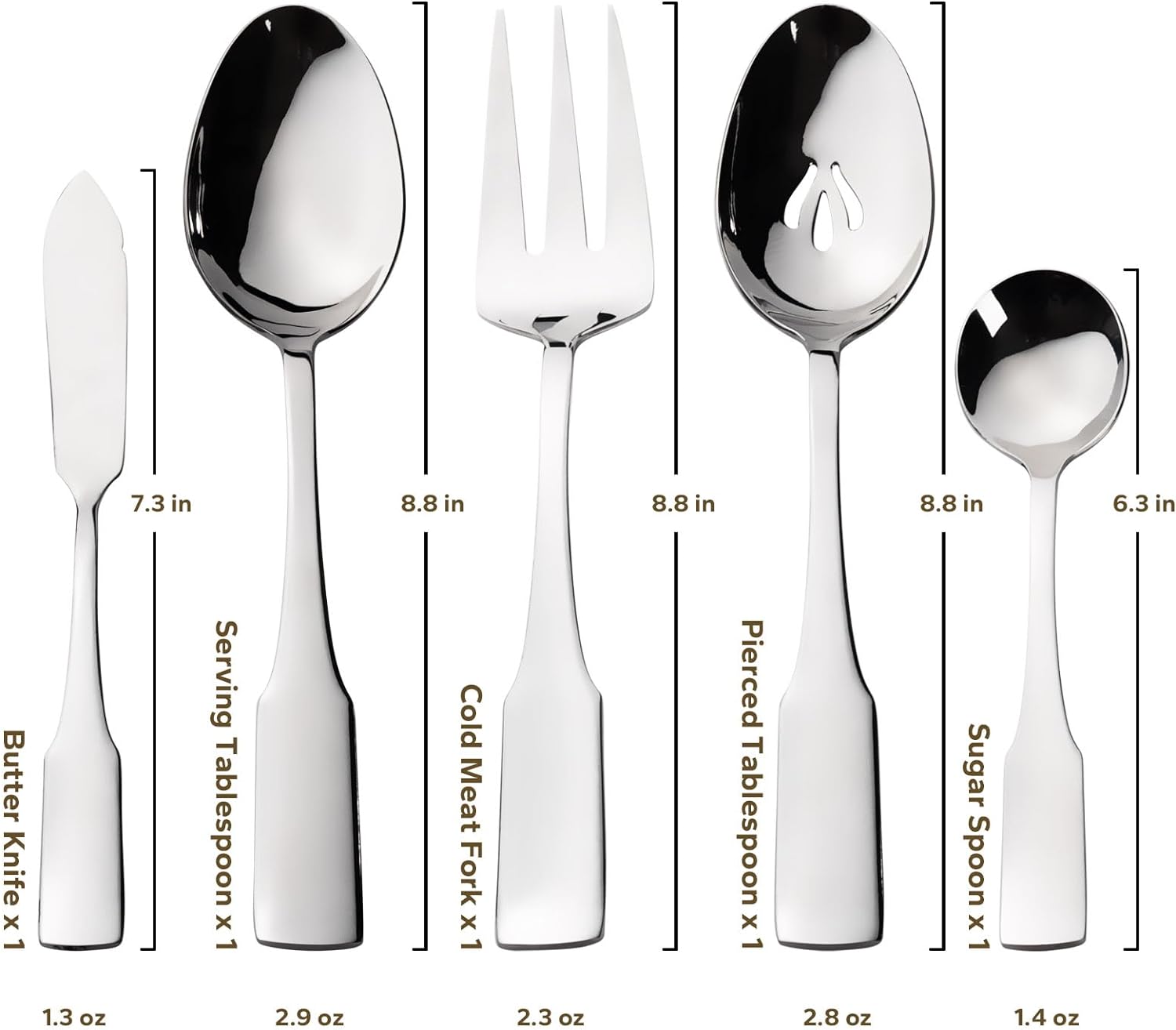 - INCLUDES: 65-piece flatware set with service for 12. Includes 12 each: dinner knife, dinner fork, salad fork, dinner spoon and teaspoon. Plus 1 each:serving tablespoon, pierced tablespoon, cold meat fork, butter knife, and sugar spoon