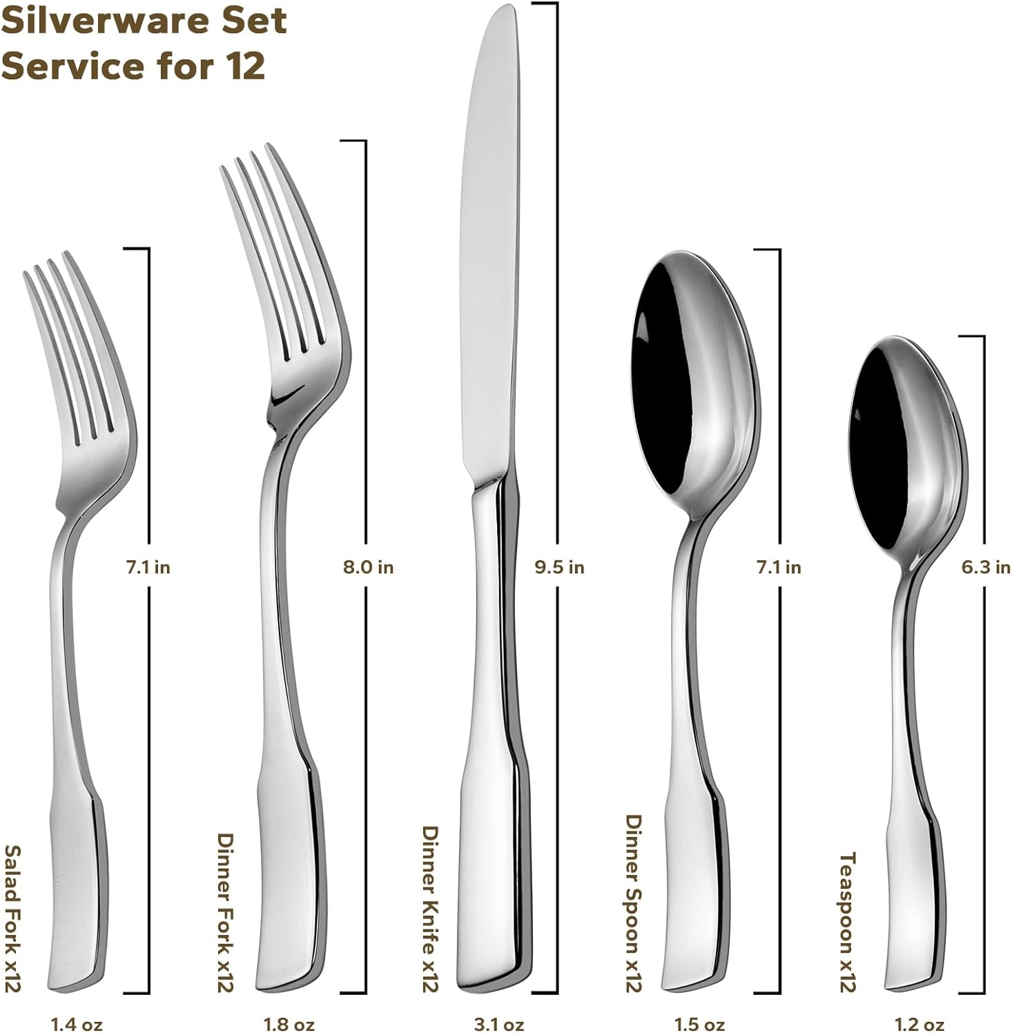 - MATERIAL: This heavy weight flatware set is made with 18/0 stainless steel.It has a thickness of 2.5-2.8mm specification which is more durable than medium weight flatware, not easily bent, and makes for a nice presentation