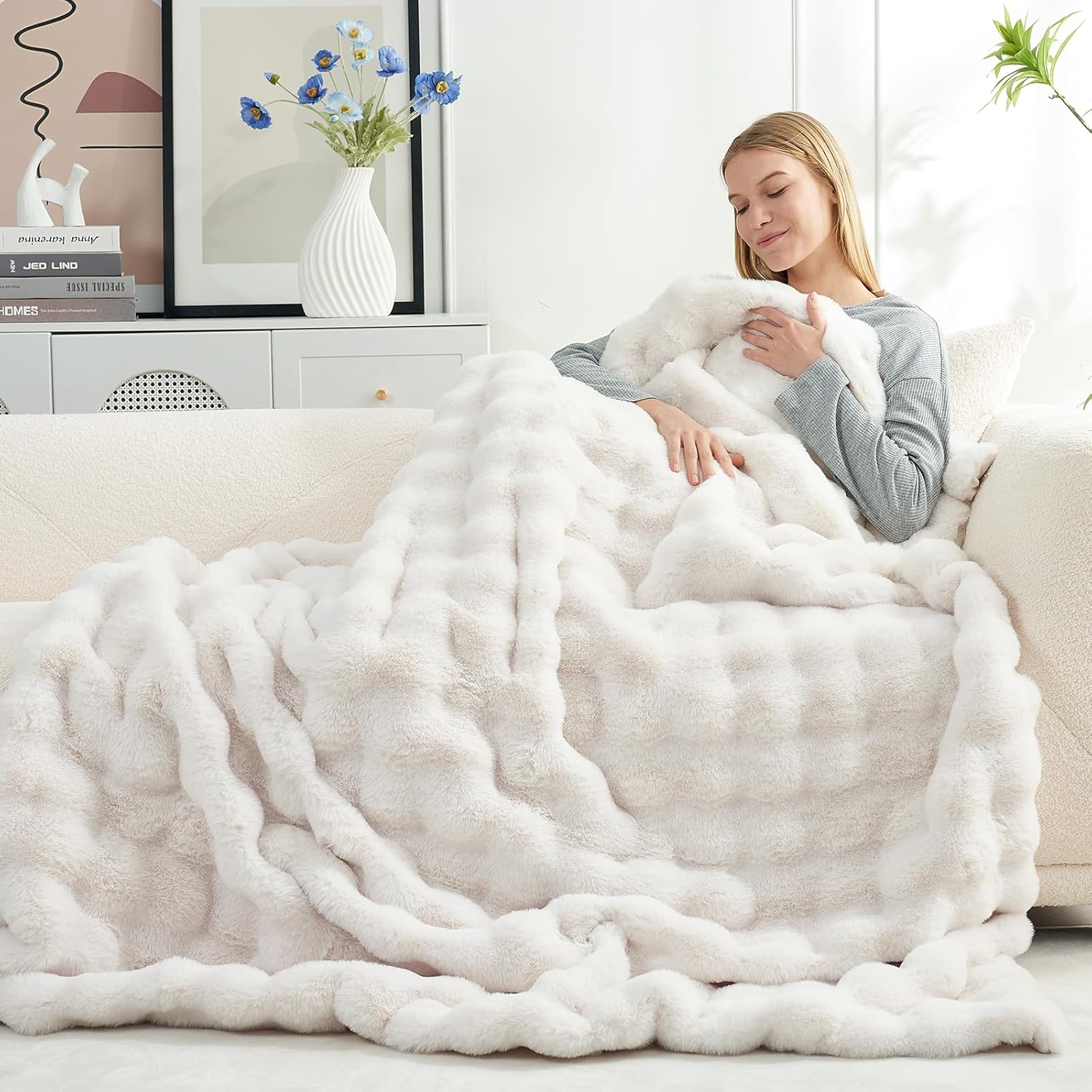 Cozy Bliss Faux Fur Throw Blanket for Couch, Fuzzy Soft Plush Thick Bubble Blanket for Sofa Bedroom Living Room, 50 * 60 Inches Cream White