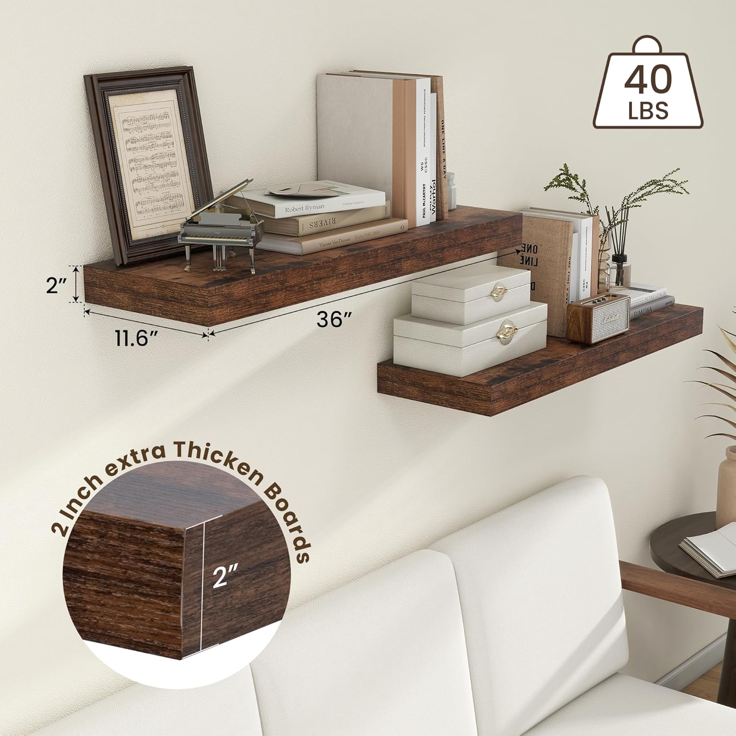 - DEEPER & THICKER SHELF - Our floating shelves measure 36W x 11.6D x 2H, deeper and thicker than usual wall shelves, which create more storage and display space for your home