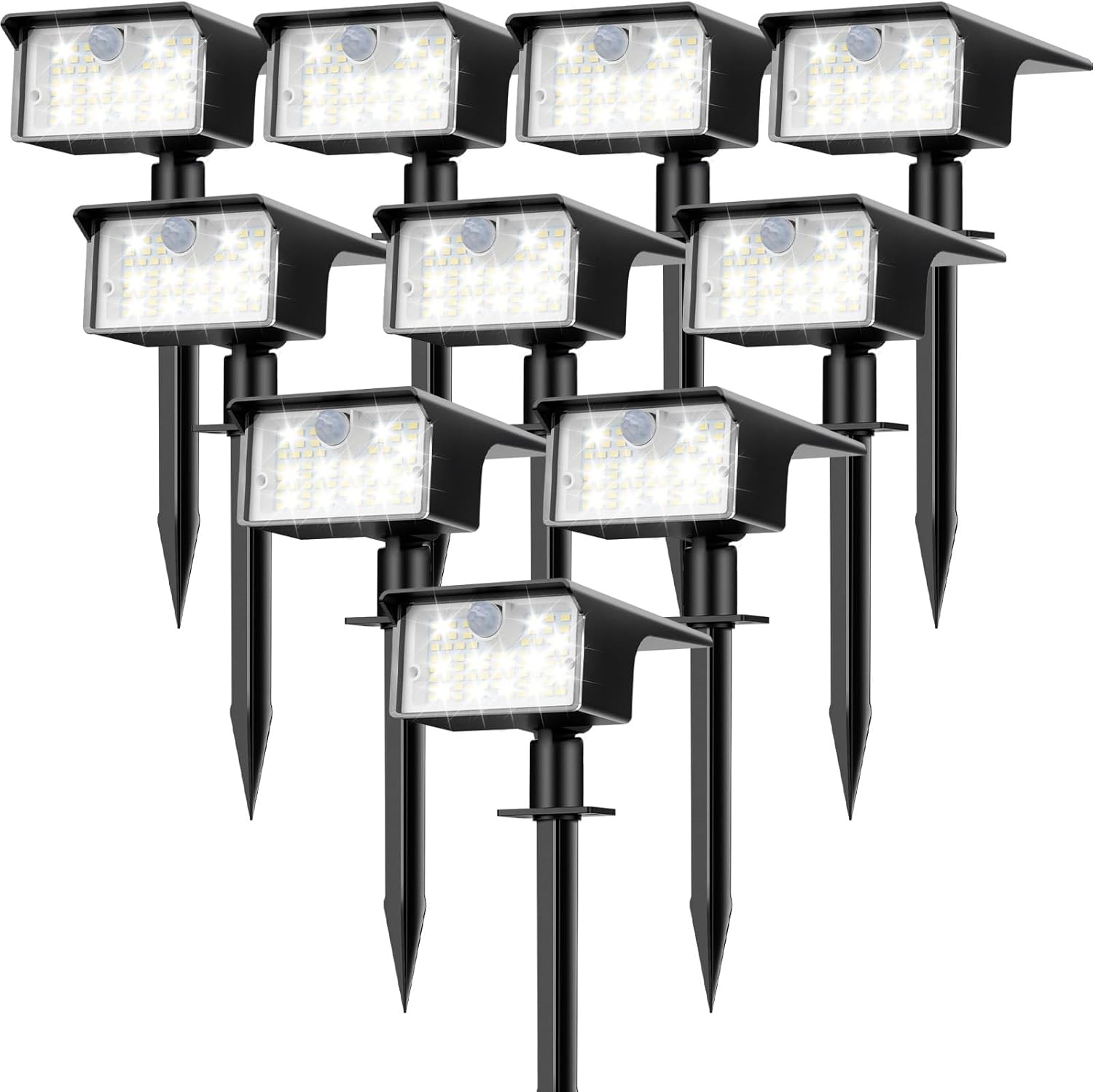 - Ultra-Bright & PIR Motion Sensor: nipify 10 pack new upgraded solar spotlights outdoor with 62 LEDs each, so they produce up to 1000 lumen of 6500K brighter cool light in the dark, light up your garden and a larger area of landscape. Built-in sensitive PIR motion sensor with 120Β° detection angle, this will give safe, timely and efficient lighting when people, animals and vehicles pass by