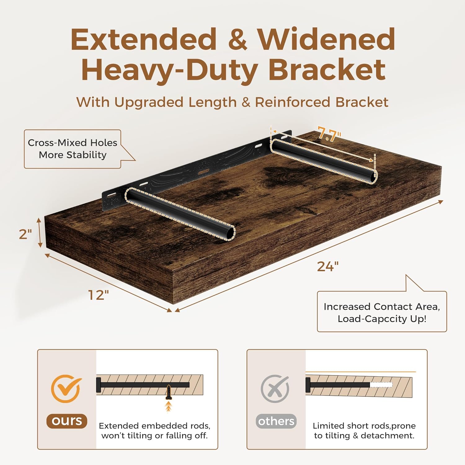 12 Inch Deep Floating Shelves, 24 x 12 Floating Shelf for Books, Rustic Wood Deep Wall Shelves for Home Storage & Display, 2" Thicked Shelves for Kitchen, Living Room, Bedroom, Rustic Brown, 1 Pack
