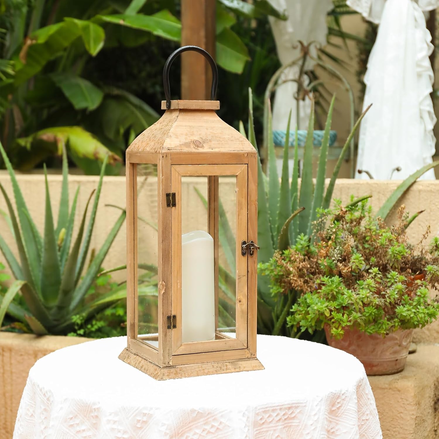 Large New Zealand Pine Lantern With Flameless Pillar Candles - IP65 Waterproof Decorative for Home Decor, Indoor Outdoor, Front Porch, Garden, Farmhouse Style