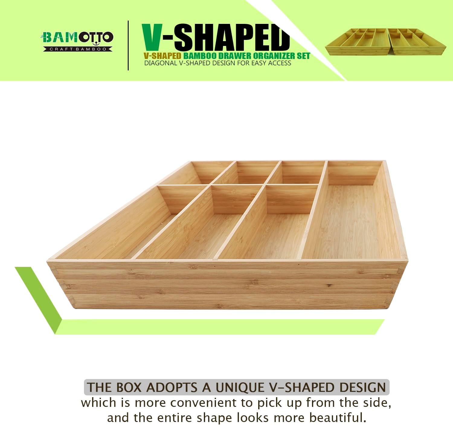 V-Shaped Extra Large Bamboo Drawer Organizer Set of 2, Kitchen Cutlery Tray Utensil Plate, Flatware&Silverware Storage Box, Wood Organizer for Bedroom, Living Room (19.6"x14.6" & 19.6"x12.4")