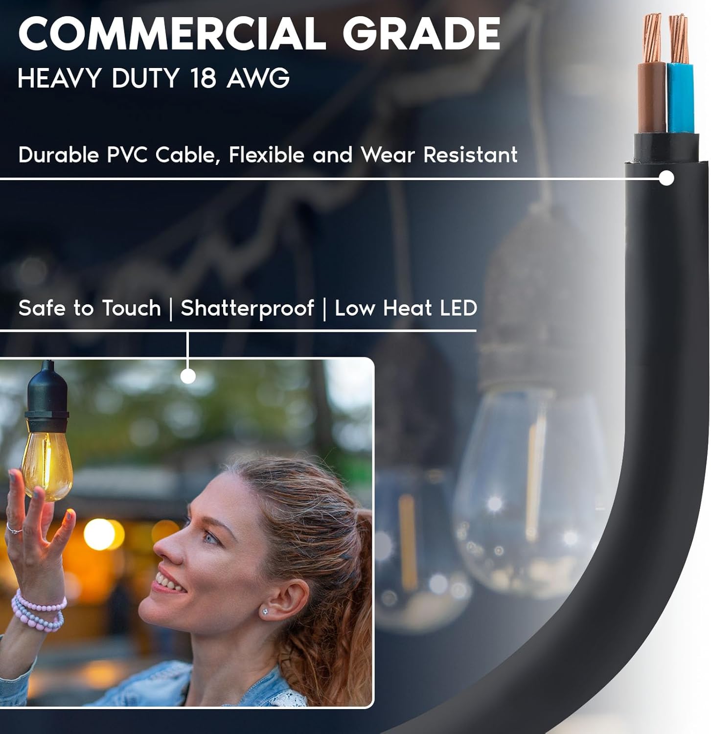 - WEATHERPROOF - Built to withstand the elements and last through the changing seasons. Our outdoor LED string lights are constructed to be commercial grade which are flexible and wear resistant from the harsh climate. These are ETL listed and IP65 waterproof rated to withstand rain, snow, wind, and high temperatures which make them virtually weatherproof. Keep these bistro lights up year round and continue to enjoy them at your convenience.