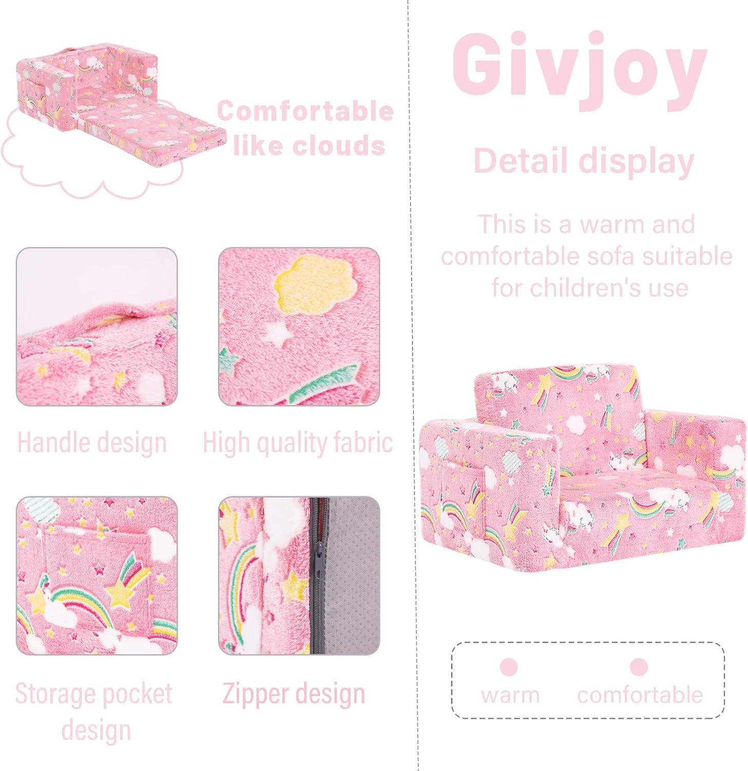 - ăMultifunctional 2-in-1 Design Unique Present for 18 months+ Boys and GirlsăThe 2-in-1 children's sofa couch is a wonderful present for all kids & toddlers on Birthdays, Christmas, or other occasions! Your child will find this small kids' couch a perfect spot for relaxing, reading, playing, or enjoying their favorite TV shows. Meanwhile, with both modern design and fashionable colors, this small couch can fit any room and add great vitality to your house.