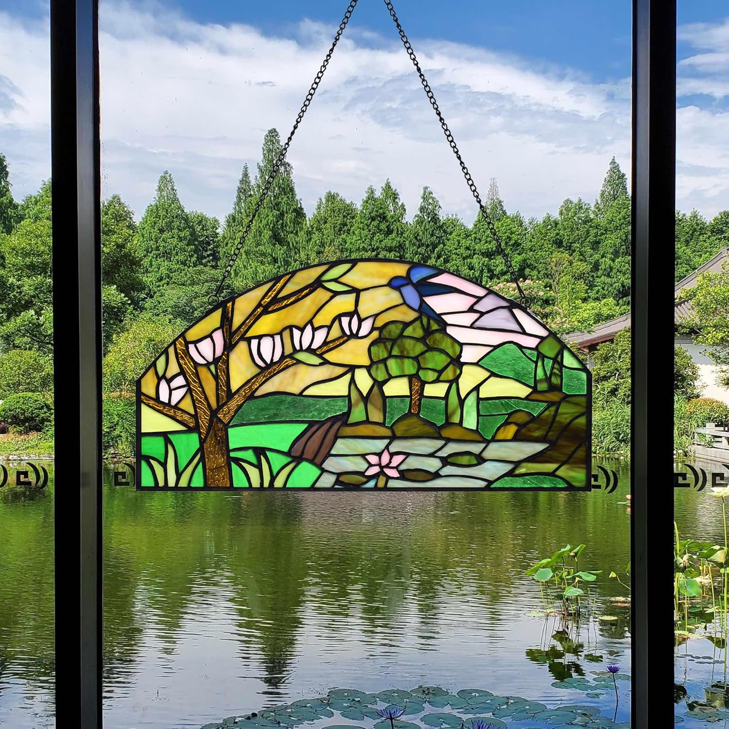 YOURANJU Half Moon Stained Glass Window Hanging Tiffany Style 16" x 8" Half-Round Window Panel Housewarming Gift Living Room Bedroom Kitchen Window Decorative Hangings with Chain (Tree)