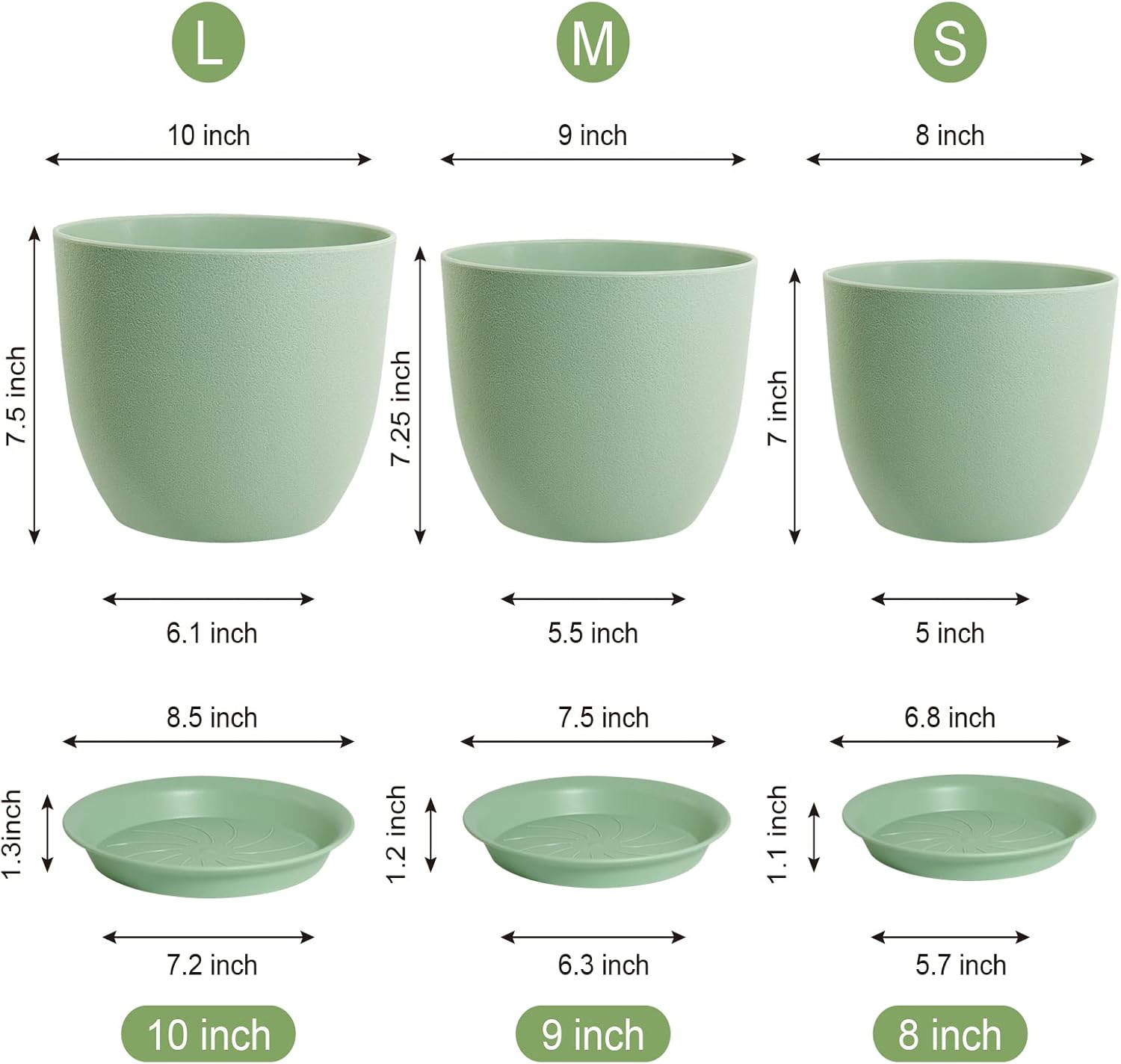Medium Plant Pots 10/9/8 inch, Flower Pots for Indoor Outdoor Plants, Set of 3 Modern Decorative Plastic Planters with Drainage Holes and Saucers for House Porch Garden Plants, Green